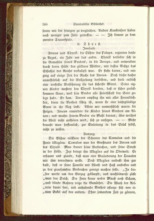 Atreus und kLhyest, die Söhne des Pelops, regierten beydezu Argos, ein Zahr um das andre. Thuest verliebte sich indie Gemahlin seines Bruders, in die Aerope, und entwendetedurch deren Hülfe den güldncn Widder, mit dessen Besitze dasSchicksal des Reichs verknüpft war. Er flöhe davon, und ent-ging auf einige Zeit der Rache des Atreus, Doch dieser dachteunaufhörlich auf die Vollziehung derselben, und hielt endlicheine verstellte Versöhnung für das sicherste Mittel. Seine eig-nen Kinder mußten den Thuest bereden, daß er sicher zurück-kommen könne, weil sein Bruder alle Feindschaft bey Seite ge-legt habe. Er kam. Arreus empfing ihn mit aller Freundlich»kcit, deren die Bosheit fähig ist, wenn sie eine leichtgläubigeBeute in ihr Netz lockt. Allein wie unmenschlich waren dieFolgen. Atreus ermordete die Kinder seines Bruders am Al-tare; und machte seinem Bruder ein Mahl daraus, über welches