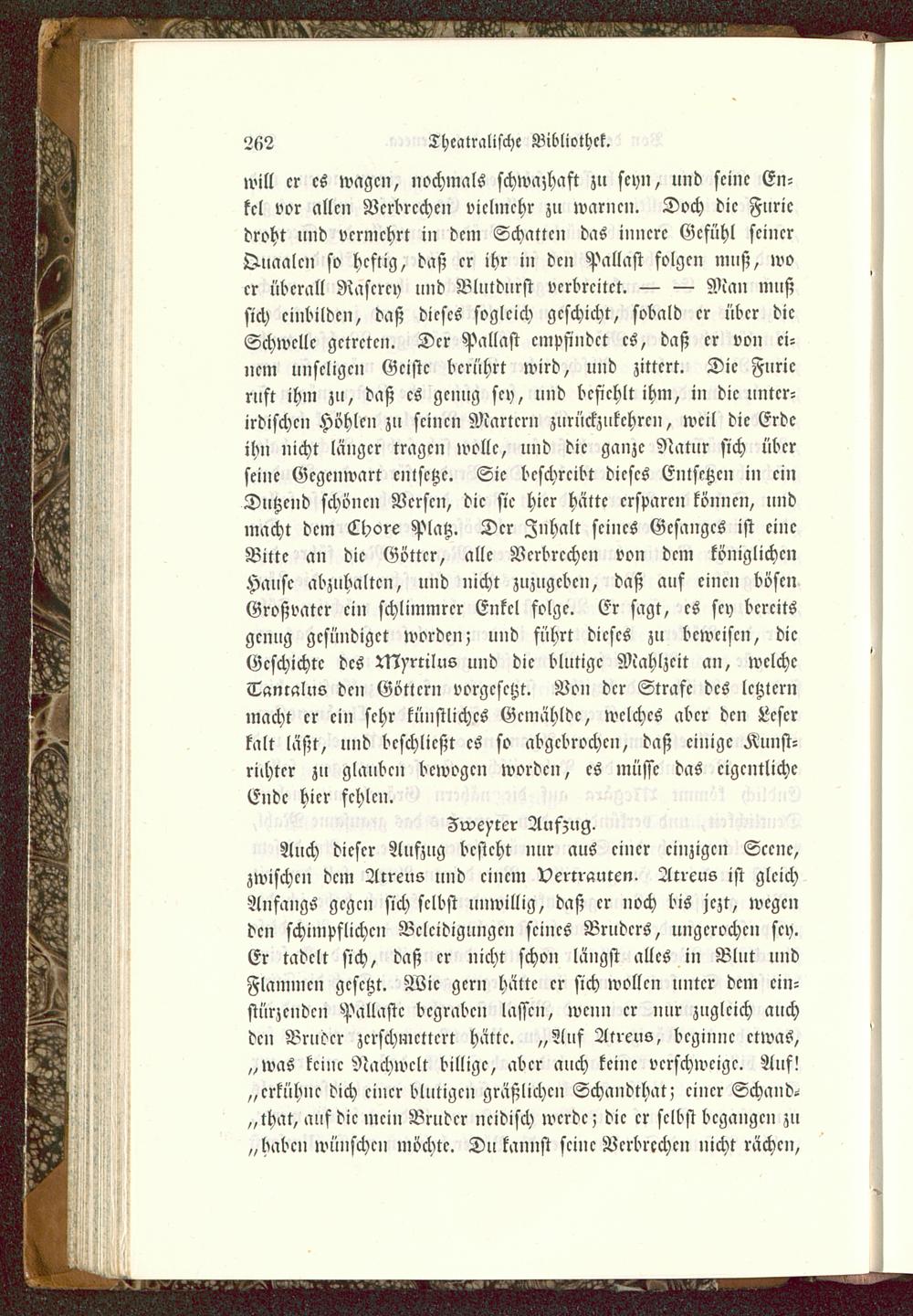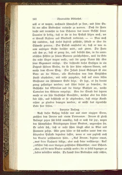 Zweiter Auszug.Auch dieser Aufzug besteht nur aus einer einzigen Scene,zwischen dem Arrcns und einem Vertrauten. Atrcus ist gleichAnfangs gegen sich selbst unwillig, daß cr noch bis jczt, wegenden schimpflichen Beleidigungen seines Bruders, ungcrochcn scy.Er tadclt sich, daß cr nicht schon längst alles in Blut undFlammen gesetzt. Wie gern hätte cr sich wollcn untcr dem ein-stürzenden Pallastc bcgrabcn lassen, wenn cr nur zugleich auchden Bruder zerschmettert hätte. „Auf Alreus, beginne etwas,„was keine Nachwelt billige, aber auch keine verschweige. Auf!„erkühne dich einer blutigen gräßlichen Schandthat; einer Schand-that, auf die mein Bruder neidisch werde; die cr sclbst begangen zu„haben wünschcn möchtc. Du kannst seine Verbrechen nicht rächen,