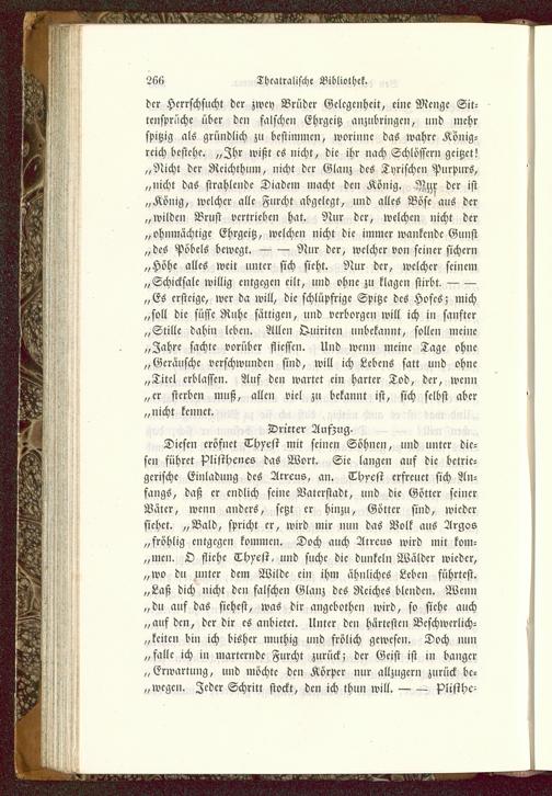 Dritter Aufzug.Diesen cröfnet Thuest mit seinen Söhnen, und unter die-sen führet Plisthenes das Wort. Sie langen auf die bctric-gcrischc Einladung des Atreus, an. Thyest erfreuet sich An-fangs, daß er endlich seine Vaterstadt, und die Götter seinerVäter, wenn anders, setzt er hinzu, Götter sind, wiedersiehet. „Bald, spricht er, wird mir nun das Volk aus Zlrgos„fröhlig entgegen kommen. Doch auch Arreus wird mit kom-„mcn. O fliehe Thycst, und suche die dunkeln Wälder wieder,„wo du unter dem Wilde ein ihm ähnliches Leben führtest.„Laß dich nicht den falschen Glanz des Reiches blenden. Wenn„du auf das siehest, was dir angebothen wird, so siehe auch„auf den, der dir es anbietet. Unter den härtesten Beschwerlich-keiten bin ich bisher muthig und srölich gewesen. Doch nun„falle ich in marternde Furcht zurück; der Geist ist in banger„Erwartung, und möchte den Körper nur allzugern zurück de-swegen. Zeder Schritt stockt, den ich thun will.--Plisthe-