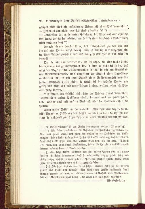 ") Sie sollen zugleich an die Ursachen der Feindschaft gedenken, dieWolf mit gutem Borbrdacht nicht hat wolle» in die Definition des Hassesbringe». Die nächste Ursache des Hasses ist die Bctracknung, das; der Klüeks-stand dieses Menschen mir oder aiidcrn Mciischen, die ich liebe, schädlichseyn kann, und zwar durch Verschulden, indem ich ih« als moralisch unvoll-kommen crkaunt habe. Mendelssohn .