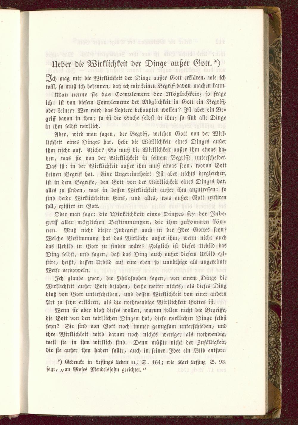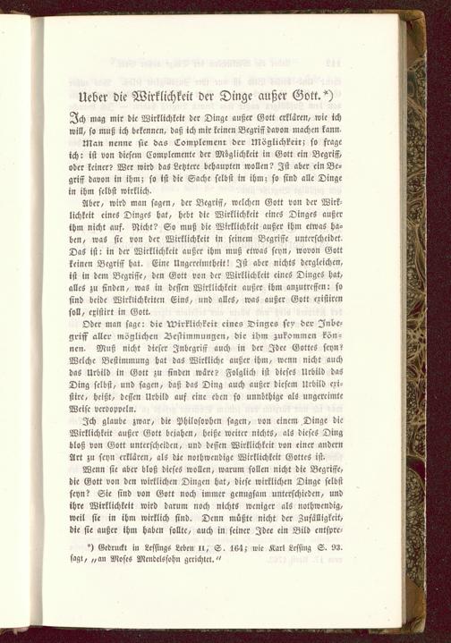 Ich glaube zwar, die Philosophen sagen, von einem Dinge dieWirklichkeit außer Gott bejahen, heiße weiter nichts, als dieses Dingbloß von Gott unterscheiden, und dessen Wirklichkeit von einer andernArt zu seyn erklären, als ke nothwendige Wirklichkeit GottcS ist.