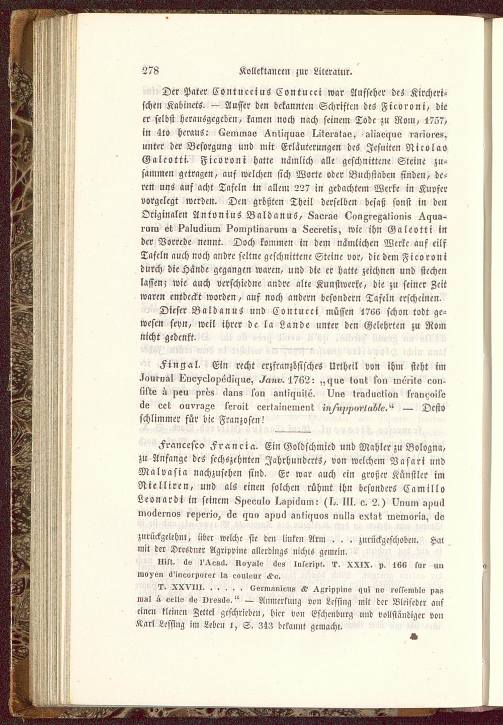 Der Pater SontucciuS Conti, cci war Aufseher des Kircheri-schen Kabinett — Ausser den bekannten Schriften des Ficoroni / dieer selbst herausgegeben, kamen noch nach seinem Tode zu Rom , 1757,in 4t0 heraus: Lcmmav ^nii^uae I^ileralav, aliae^uo rmiores,unter der Besorgung und mit Erläuterungen dcS Jesuiten NicolaoGalcotti- Ficoroni hatte nämlich alle geschnittene Steine zu-sammen getragen, auf welchen sich Worte oder Buchstabe» finden, de-ren uns auf acht Tafeln in allem 227 in gedachtem Werke in Kupfervorgelegt werden. Den größten Theil derselben besaß sonst in denOriginalen Antonius Baldanus, 8aer->v <?onßregs>ioni8 ^ua-rum et psluäium pomptinarum a 8ccreli8, wie ihn Galeotti inder Vorrede nennt. Doch kommen in dem nämlichen Werke auf eilfTafeln auch noch andre seltne geschnittene Steine vor, die dem Ficoronidurch die Hände gegangen waren, und die er hatte zeichnen und stechenlassen; wie auch vcrschicdnc andre alte Kunstwerke, die zu seiner Zeitwaren entdeckt worden, auf noch andern besondern Tafeln erscheinen.