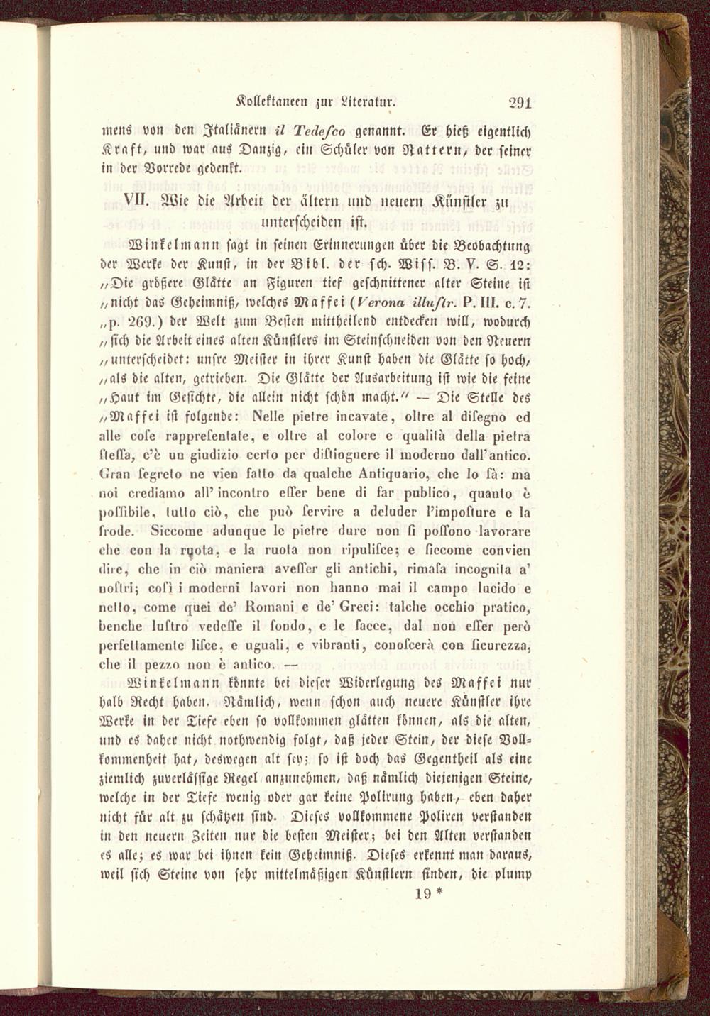 Winkeln, ann sagt in seinen Erinnerungen über die Beobachtungder Werke der Kunst, in der Bibl. der sch. Wiss. B. V. S- 12:„Die größere Glätte an Figuren tief geschnittener alter Steine ist„nicht das Geheimniß, welches Maffei (»^on» -tt»/,?-. p. III. o. 7.„p> 2t!9,) der Welt zum Besten mittheilend entdecken will, wodurch„sich die Arbeit eines alten Künstlers im Steinschneiden von den Neuern„unterscheidet: unsre Meister in ihrer Kunst haben die Glatte so hoch,„als die alten, getrieben. Die Glätte der Ausarbeitung ist wie die feine„Haut im Gesichte, die allein nicht schön macht." — Die Stelle des„Maffei ist folgende: l^elle nielre mesvale, ollro sl uilegnc» c6nll» oole rspnrelonlalo, o olll'o al eoloi'e e yuglilü clella pielral'lells, o'i: ur> ßiuc!i/.io eei'Io per liislioguere il moilerno lisll'aiilico.l!,.in texi-ela no vie» sallo cla ^ualclio ^nli^usiio, eliv lo sü: ma»oi e>vlligmo all'iaeontio elker Iieno lli sai' nulilieo, c^uinilo <:uol'livile, lullo cio, clio n»<> lei vüe a (leluller I'imnoslure v lasittile. 8iccomo silunciue lo pieti'e iluio von li pollono lavoi-si'e,'Iie eon la ruals. o la ruola nan lioulisee; e liecome eonvien>Ii>o, clio in oi» maniera avelkei' gli iwtieln, riliuisa ineognila a'iiallil; eosi i mollcini I.ivvii nnn I>snno msi il oamno luoitlo <z»(!>Io, come c^uei cle' liomimi e lls'Kreci : lalelie oeeüio pratieo,Iieiielio luftro vellclse il sondn, e lo saeee, «lal noa cll'el' peiouersellamenlo lisee. e uzuali, o vil^i-anti, eolio5eeiü coo lleurez^a,ollv il per,.n »on v .inlico. —