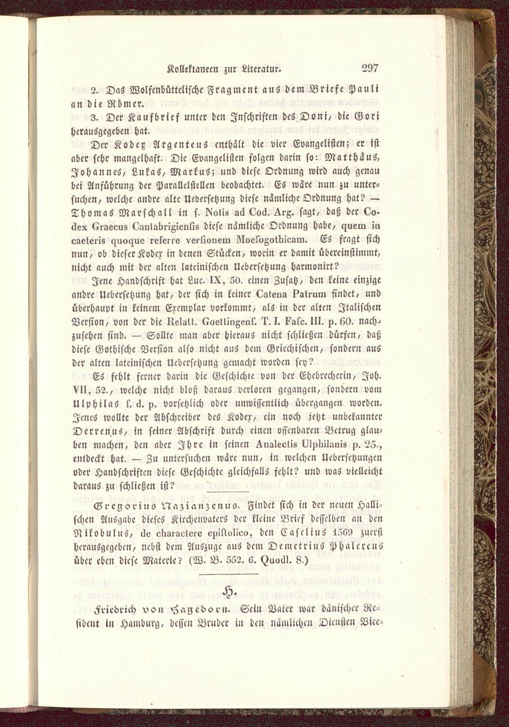 Der Kodex Argentcus enthalt die vier Evangelisten, er istaber sehr mangelhaft. Die Evangelisten folgen darin so: Matthäus,Johannes, LukaS, MarkuS; und diese Ordnung wird auch genaubei Anführung der Parallelstellen beobachtet. Es wäre nun zu unter-suche»/ welche andre alte Ucbersetzung diese nämliche Ordnung hat? —ThomaS Marsch all in s. I^olis aä (üocl. ^rx. sagt, daß der Lo-itex Kraeeus CÄnlalirigienlis diese nämliche Ordnung habe/ ezueiu iaeaetoi'i8 cjuoyue relerie verlivaera kloeioZotkioilm. ES fragt sichnun/ ob dieser Kodex in denen Stücken/ worin er damit übereinstimmt,nicht auch mit der alten lateinischen Uebersctzung harmonirt?