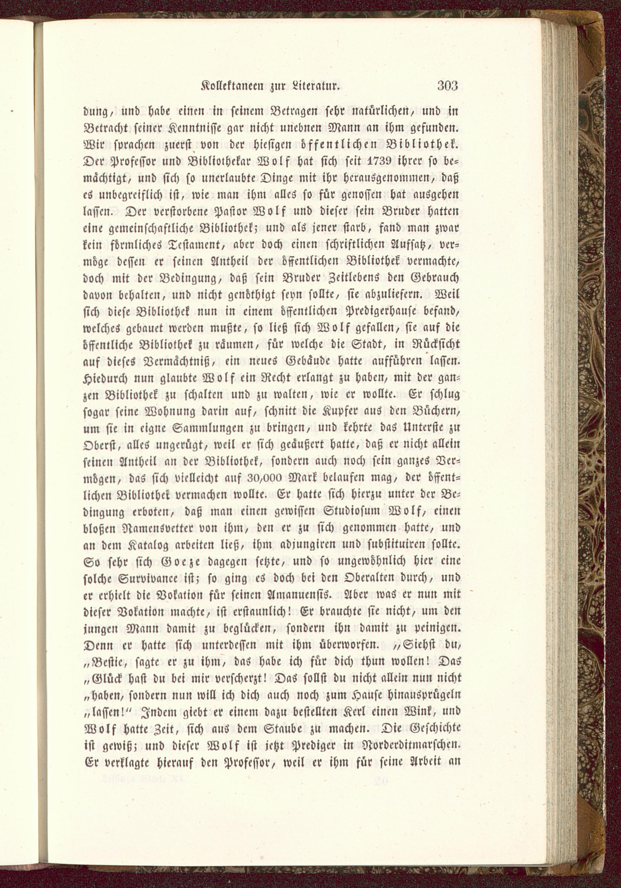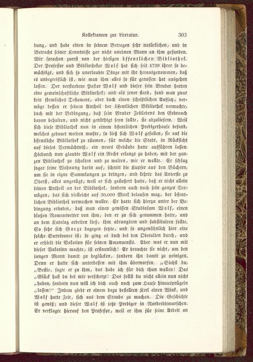 dung, und habe einen in seinem Betragen sehr natürlichen, und inBetracht seiner Kenntnisse gar nicht unebnen Mann an ihm gefunden.Wir sprachen zuerst von der hiesigen öffentlichen Bibliothek.Der Professor und Bibliothekar Wolf hat sich seit 1739 ihrer so be-mächtigt, und sich so unerlaubte Dinge mit ihr herausgenommen, daßes unbegreiflich ist, wie man ihm alles so für genossen hat ausgehenlassen. Der verstorbene Pastor Wolf und dieser sein Bruder hatteneine gemeinschaftliche Bibliothek; und als jener starb, fand man zwarkein förmliches Testament, aber doch einen schriftlichen Aufsatz, ver-möge dessen er seinen Antheil der öffentlichen Bibliothek vermachte,doch mit der Bedingung, daß sein Bruder Zeitlebens den Gebrauchdavon behalten, und nicht genöthigt sevn sollte, sie abzuliefern. Weilsich diese Bibliothek nun in einem öffentlichen Prcdigerhause befand,welches gcbauet werben mußte, so ließ sich Wolf gefallen, sie auf dieöffentliche Bibliothek zu räumen, für welche die Stadt, in Rücksichtauf dieses Vermächtniß, ein neues Gebäude hatte aufführen lassen-Hicdurch nun glaubte Wolf ein Recht erlangt zu haben, mit der gan-zen Bibliothek zu schalten und zu walten, wie er wollte. Er schlugsogar seine Wohnung darin auf, schnitt die Kupfer aus den Büchern,um sie in eigne Sammlungen zu bringen, und kehrte das Unterste zuOberst, alles ungcrügt, weil er sich geäußert hatte, daß er nicht alleinseine» Antheil an der Bibliothek, sondern auch noch sein ganzes Ver-mögen, das sich vielleicht auf 30,00» Mark belaufen mag, der öffent-lichen Bibliothek vermachen wollte. Er hatte sich hierzu unter der Be-dingung erboten, daß man einen gewissen Studiosum Wolf, einenbloßen Namensvetter von ihm, den er zu sich genommen hatte, undan dem Katalog arbeiten ließ, ihm adjungircn und substituircn sollte.So sehr sich Gocze dagegen setzte, und so ungewöhnlich hier einesolche Survivance ist; so ging cS doch bei den Oberalten durch, under erhielt die Vokativ» für seinen AmanuensiS. Aber was er nun mitdieser Vokation machte, ist erstaunlich! Er brauchte sie nicht, um denjungen Mann damit zu beglücken, sondern ihn damit zu peinigen.Denn er hatte sich unterdessen mit ihm überwerfen. „Siehst du,„Bestie, sagte er zu ihm, das habe ich für dich thun wollen! Da»„Glück hast du bei mir verscherzt! Das sollst du nicht allein nun nicht„haben, sondern nun will ich dich auch noch zum Hause hinauSprügeln„lassen!" Indem giebt er einem dazu bestellten Kerl eine» Wink, undWolf hatte Zeit, sich aus dem Staube zu machen. Die Geschichteist gewiß; und dieser Wolf ist jetzt Prediger in Nordcrditmarschcn.Er verklagte hierauf den Professor, weil er ihm für seine Arbeit an