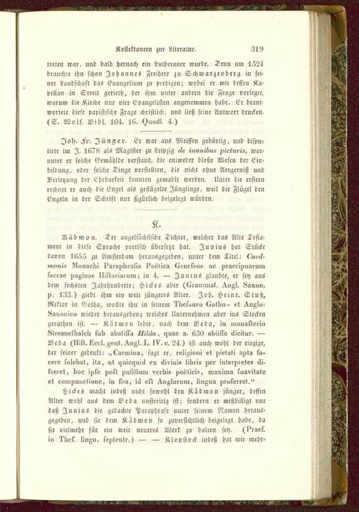 HickeS macht indeß nicht sowohl den Kadmon jünger, dessenAlter wohl auS dem Beda unstreitig ist; sondern er mißbilligt nurdaß IuniuS die gedachte Paraphrase unter seinem Namen heraus-gegeben, und stc dem Kädmon so zuversichtlich beigelegt habe, dasie vielmehr für ein weit neueres Werk zu hallen sey. (praes.i» ^Iie5. lingn. levkenli'.) — — Klopft ock indeß hat mir mehr-