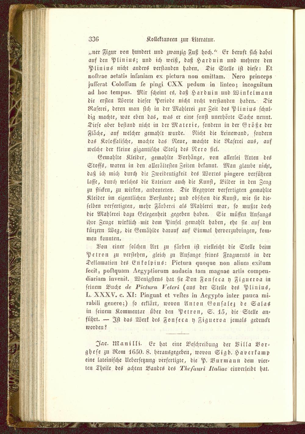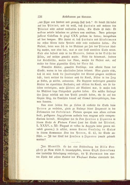 Von einer solchen Art zu färben ist vielleicht die Stelle beimPetron zu verstehen, gleich zn Anfange seine« Fragments in derTcklamalion des EnkolpiuS: piclma «iuol>uv von oliuni exilumkeeit, pol'lyuom .Ve^)j>liorum ouekaeia tain magnae srliz comucu-diaiiam invcnit. Wenigstens hat sieben Fouscca y Figueroa inseinem Buche l/e ^<c/,-^n kc/ck-i (ans der Stelle des PliniuS,1^. XXXV. c. XI: l^ingunt et vetlcs in ^c^ulo iiilcr pauca mi-laliili genere;) so erklärt, wovon Anton Gousalez de SalaSin seinem Kommentar über den Petron, S. 45, die Stelle an-fuhrt. — Ist das Werk des Fonseca i) Figueroa jemals gedrucktworden?