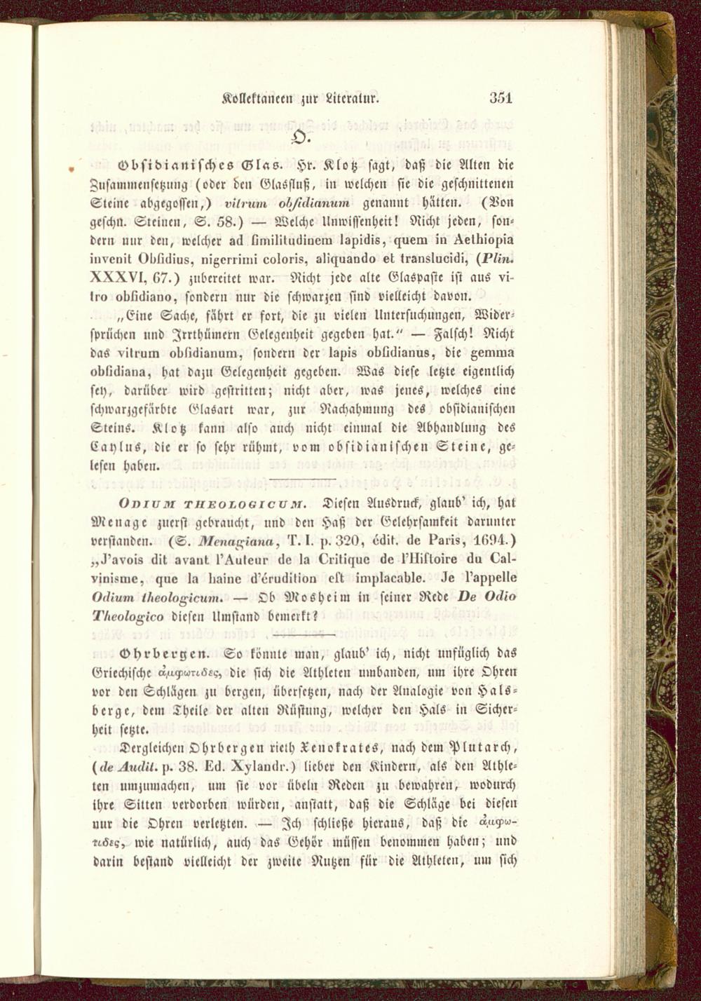 Odsidianischcs Glas. Hr. Klotz sagt, daß die Alle» dieFusammeusctznng (oder den Glasfluß, in welchen sie die geschnittene»Steine abgegossen,) „//i-«,» o/>/,'<//nnn,» genannt hätte». (Vongcschn. Steine», S. 58.) — Welche Unwissenheit! Nicht jeden, son-dern nur den, welcher aä limilituiliuew Ispiiiis, lzuein in ^elkiom'aiuvenit 0I^li(Iiu8, nißerrimi eoloris, sli^uarxlo el Irsnsluvirli, (/Vi».XXXVl, s»7.) jubereitet war. Richt jede alte ElaSpasic ist aus vi-Iro oliliciiaiio, sonder» nur die schwarzen sind vielleicht davon.