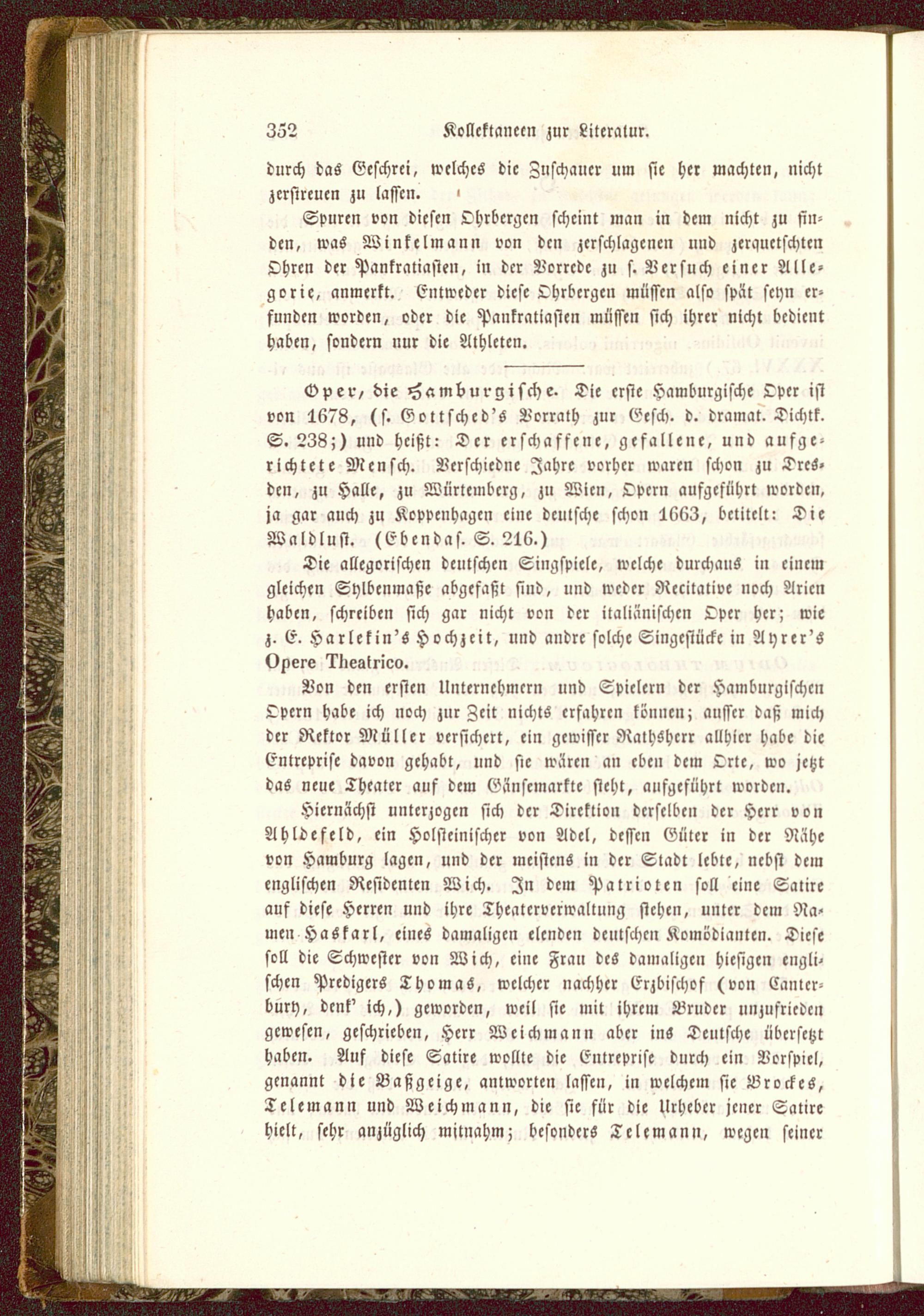 Hierncichst unterzogen sich der Direktion derselben der Herr vonAhldefeld, ein Holsteinischer von Adel, dessen Güter in der Nähevon Hamburg lagen, und der meistens in der Stadt lebte, nebst demenglischen Residenten Wich. In dem Patrioten soll eine Satireauf diese Herren und ihre Theatcrverwaltung stehen, unter dem Na-men HaSkarl, eines damaligen elenden deutschen Komödianten. Diesesoll die Schwester von Wich, eine Fran des damaligen hiesigen engli-schen Predigers Thomas, welcher nachher Erzbischof (von Cantcr-bury, denk' ich,) geworden, weil sie mit ihrem Bruder unzufriedengewesen, geschrieben, Herr Weich mann aber ins Deutsche übersetzthaben. Auf diese Satire wollte die Entreprise durch ein Vorspiel,genannt die Baßgeige, antworten lassen, in welchem sie Brocke 6,Telemann und Weichmann, die sie für die Urheber jener Satirehielt, sehr anzüglich mitnahm; besonders Telemann, wegen seiner