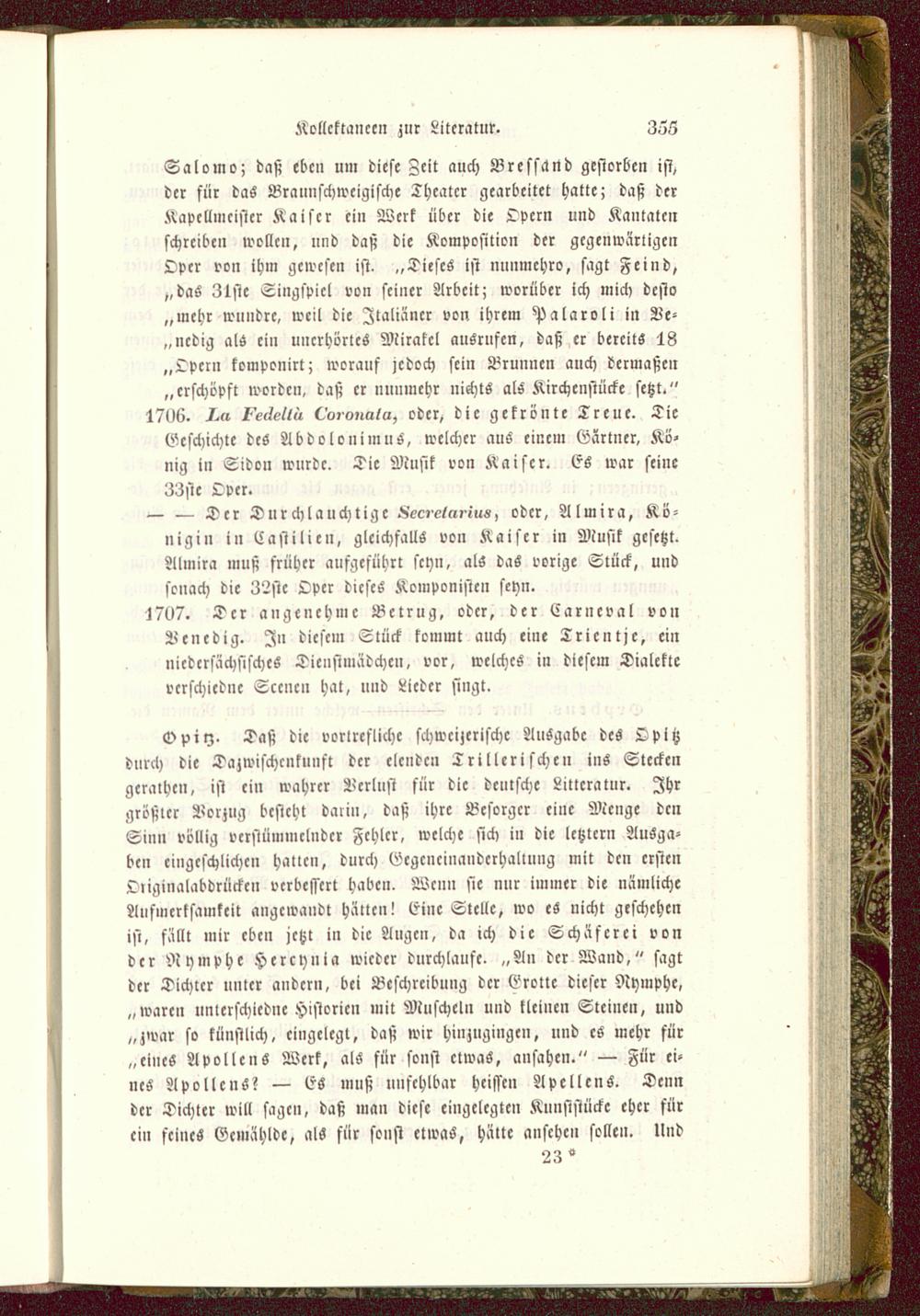 Opilz- Daß die vorlrefliche schweizerische Ausgabe des Opltzdurch die Dazwischcnkunft der elenden Trillcrischen ins Steckengerathen, ist ein wahrer Verlust für die deutsche Litteratur. Ihrgrößter Vorzug besteht darin, daß ihre Bcsorgcr eine Menge denSin» völlig verstümmelnder Fehler, welche sich in die letztem Ausga-ben ciiigeschlichcn hallen, durch Gcgc»ci»andcrhaltung mit den ersten>Inginalabdrückcn verbessert haben. Wenn sie nur immer die nämlicheAufmerksamkeit angewandt hätten! Eine Stelle, wo es nicht geschehenist, fällt mir eben jetzt in die Angcn, da ich die Schäferei vonder Nymphe Hercynia wieder durchlaufe. „An der Wand," sagtder Dichter unter andern, bei Beschreibung der Grotte dieser Nymphe,„waren unterschied»! Historien mit Muscheln und kleinen Steinen, und„zwar so künstlich, eingelegt, daß wir hinzugiiigc», und cS mehr für„eines Apolle nS Werk, als für sonst etwas, ansahen." — Für ei-nes ApollcnS? — t5S muß unfehlbar hcissc» ApellcnS. Dennder Dichter will sage», daß ma» diese eiiigclegtc» Kunststücke eher fürein feines Gemählde, als für sonst etwas, hätte anschcii solle». Und