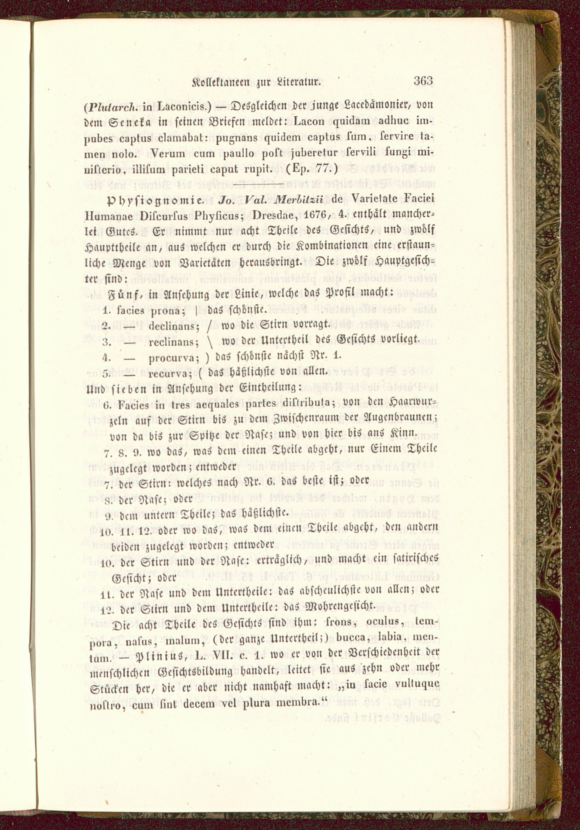 lt. der Nase und dem Untertheile: daS abscheulichste von allen; oder1?. der Stirn und dem Untertheile: daS Mohrcngcsichr.Die acht Theile deS GcsichtS sind ihm: srvus, oculus, lein-noiu, ual'uü) innlmn, (der ganze Untertheil;) linee-z, Isliia. nie»-j,„„ _ PliniuS, I.. VII. c. 1. wo er von der Verschiedenheit dermenschlichen Gcsichtöbildung handelt, leitet sie auS zehn oder mehrStücken her, die er aber nicht namhaft macht: „iu lueie vultunue»ul'li'o, ouin linl cleveiu vel nlura iileinliia."