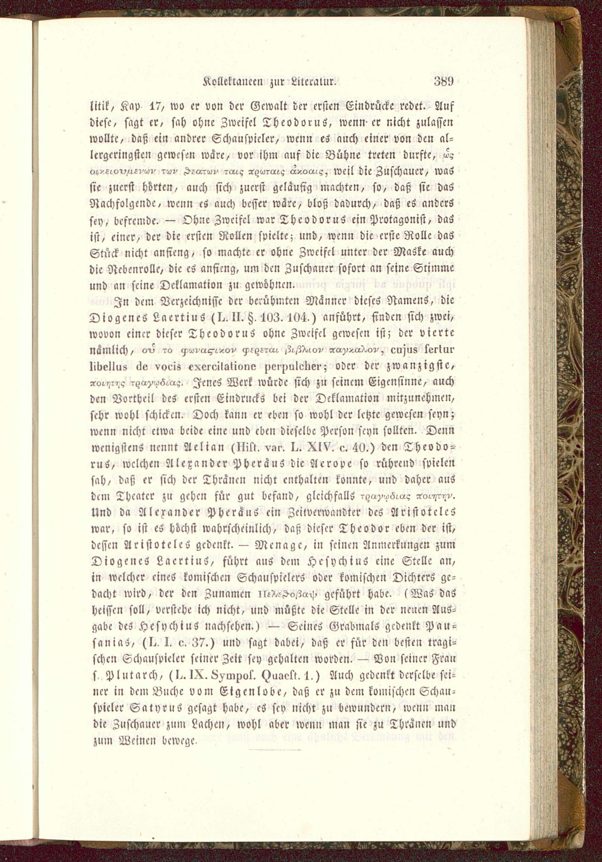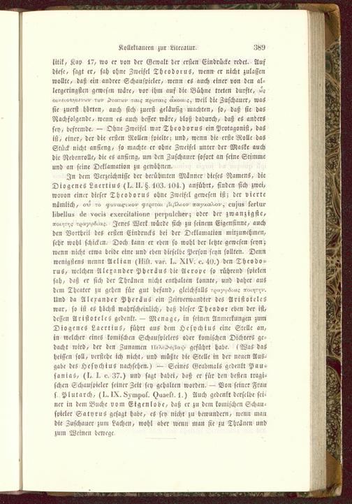 liliellus <Io vo^iz exervilalittnc: j>ci'i>ulc!ie>'; oder der zwanzigste,50^15? i^a^öla,', JcncS Werk würde sich zu seinem Eigensinne, auchden Vortheil des ersten Eindrucks bei der Deklamation mitzunehmen,sehr wohl schicken. Doch kann er eben so wohl der letzte gewesen seyn;wenn nicht etwa beide eine und eben dieselbe Person seyn sollten. Dennwenigstens nennt Aclian (IM. v-»-. I.. XIV. c. 40.) den Theodo-ruS, welchen Alexander PhcräuS die Acropc so rührend spielensah, daß er sich der Thränen nicht enthalten konnte, und daher auSdem Theater zu gehen für gut befand, gleichfalls ^c-z'^öi«? ^o^v.Und da Alexander PhcräuS ein Zcitverwandtcr des Aristoteleswar, so ist cS höchst wahrscheinlich, daß dieser Theodor eben der ist,dessen Aristoteles gedenkt- — Menage, in seinen Anmerkungen zumDiogenes LaertiuS, führt ans dem HcsychiuS eine Stelle an,in welcher eines komischen Schauspielers oder komischen Dichters ge-dacht wird, der den Zunamen n-?.^c>/Z«^, geführt habe. (WaS daSheissen soll, verstehe ich nicht, und müßte die Stelle in der neuen Aus-gabe des HesychiuS nachsehen.) — Seines Grabmals gedenkt Pan-sän ias, (I.. I. e. 37.) und sagt dabei, daß er für den besten tragi-schen Schauspieler seiner Zeit sey gehalten worden. — Don seiner Fraus, Plutarch , (I.. IX. L^mpol. yuaett. 1.) Auch gedenkt derselbe sei-ner in dem Buche vom Etgenlobc, daß er zu dem komischen Schau-spieler SatyruS gesagt habe, es sey nicht zn bewundern, wenn mandie Zuschauer zum Lachen, wohl aber wenn man sie zu Thränen undzum Weinen bewege.