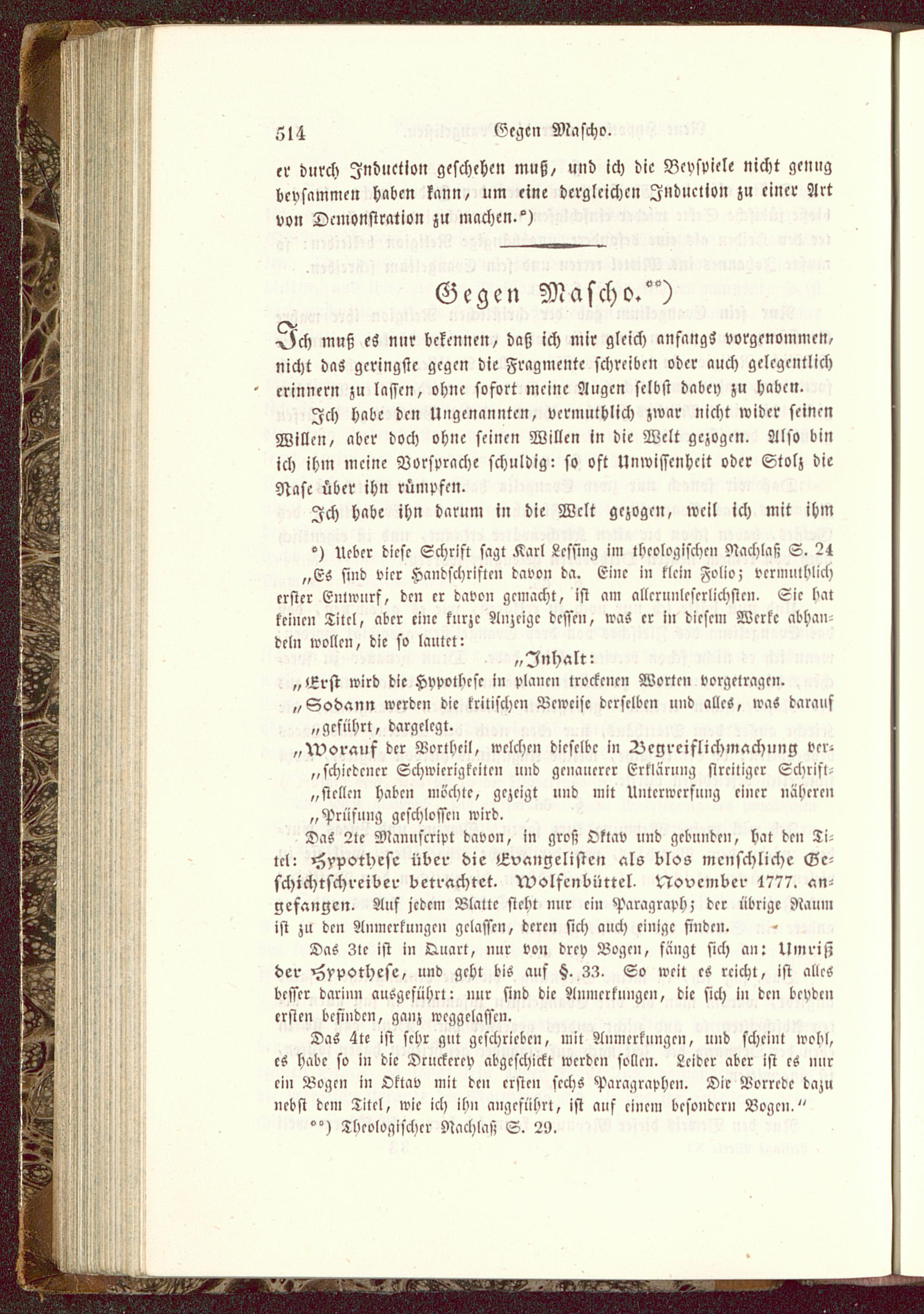 Das 2>e Manuscript davon, in groß Oktav und gebunden, hat den Ti^tcl: Hypothese über die Evangelisten als blos menschliche Ge-schichtschreiber betrachtet, wolfcnbiittel. November t777. an-gefangen. Auf jedem Blatte steht mir ei» 'Paragraph; der übrige Raumist zu den Anmerkungen gelassen, deren sich auch einige finden.