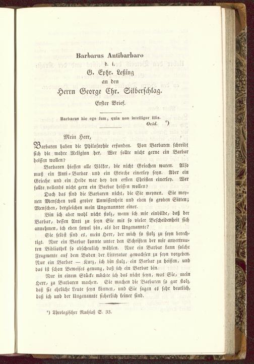 Barbaren hiessen alle Völker, die nicht Griechen waren. Alsomuß ein Anti-Barbar und ein Grieche einerlei) seyn. Aber einGrieche und ein Heide war bey den ersten Christen einerley. Wersollte vollends nicht gern ein Barbar heisst wolle»?