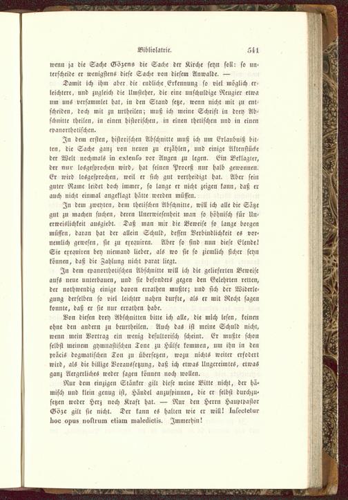 Von diesen drey Abschnitte» bitte ich alle, die mich lesen, keinenohne den andern zu beurtheilen. Auch das ist meine Schuld nicht,wenn mein Vertrag ein wenig dcsullorisch scheint. Er mußte schonselbst meinem gymnastischen Tone zu Hülfe kommen, um ihn in denpräcis dogmatischen Ton zu übersetze», wozu nichts weiter erfodcrtwird, als die billige Voraussetzung, daß ich etwas Ungereimtes, etwasganz AcrgcrlichcS weder sagen könne» »och wollen.