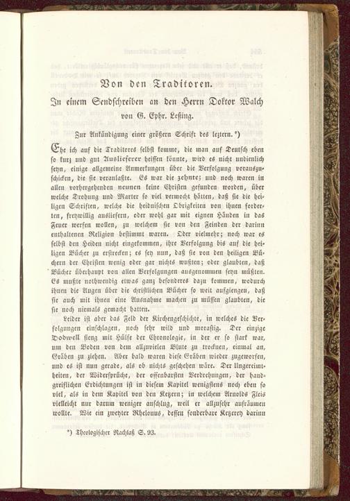 ^.'he ich auf die TraditcrcS selbst komme, die man auf Deutsch ebenso kurz und gut Auslicferev heißen konnte, wird es nicht undienlichseyn, einige allgemeine Anmerkungen über die Verfolgung vorauSzu-schicke», die sie veranlaßte. Es war die zehnte; und noch waren inallen vorhergehenden neunen keine Christen gefunden worden, überwelche Drohung und Marter so viel vermocht hätten, daß sie die hei-ligen Schriften, welche die heidnischen Obrigkeiten von ihnen forder-ten, frcywillig ausliefern, oder wohl gar mit eignen Händen in dasFeuer werfen wollen, zu welchem sie von den Feinden der darin»enthaltene» Religion bestimmt waren. Oder vielmehr; noch war esselbst den Heiden nicht ciiigckommen, ihre Verfolgung bis auf die hei-ligen Bücher zu erstrecken; es sey nun, daß sie von den heiligen Bü-chern der Christen wenig oder gar nichts wußten; oder glaubten, daßBücher überhaupt von allen Verfolgungen ausgenommen seyn müßten.Es mußte nothwendig etwas ganz besonderes dazu kommen, wodurchihnen die Augen über die christlichen Bücher so weit aufgiengen, daßsie auch mit ihnen eine Ausnahme machen zu müssen glaubten, diesie noch niemals gemacht hatten.