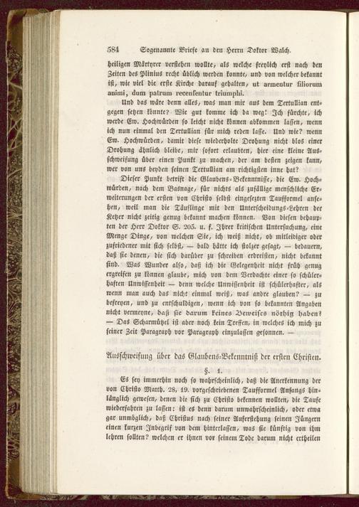 Und das wäre denn alles, was man mir aus dem Tertullian ent-gegen setzen könnte? Wie gut komme ich da weg! Ich fürchte, ichwerde Ew. Hochwürdcn so leicht nicht können abkommen lassen, wennich nun einmal den Tertullian für mich reden lasse. Und wie? wennEw. Hochwürden, damit diese wiederholte Drohung nicht blos einerDrohung ähnlich bleibe, mir sofort erlaubten, hier eine kleine Aus-schweifung über einen Punkt zu machen, der am besten zeigen kann,wer von uns beyden seinen Tertullian am richtigsten innc hat?