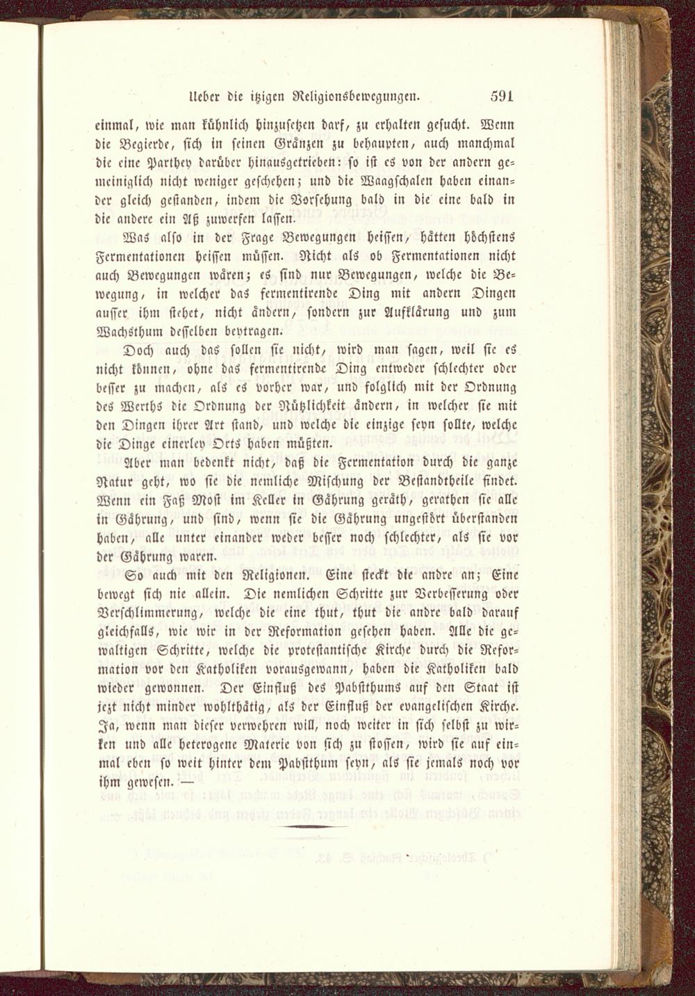 So auch mit den Religionen. Eine steckt die andre an. Einebewegt sich nie allein. Die nemlichen Schritte zur Verbesserung oderVerschlimmerung, welche die eine thut, thut die andre bald daraufgleichfalls, wie wir in der Reformation gesehen haben. Alle die ge-waltigen Schritte, welche die protestantische Kirche durch die Refor-mation vor den Katholiken vorausgewann, haben die Katholiken baldwieder gewonnen. Der Einfluß des PabstthumS auf den Staat istjczt nicht minder wohlthätig, als der Einfluß der evangelischen Kirche.Ja, wenn man dieser verwehren will, noch weiter in sich selbst zu wir-ken und alle heterogene Materie von sich zu flössen, wird sie ans ein-mal eben so weit hinter dem Pabsithum sevn, als sie jemals noch vorihm gewesen. —