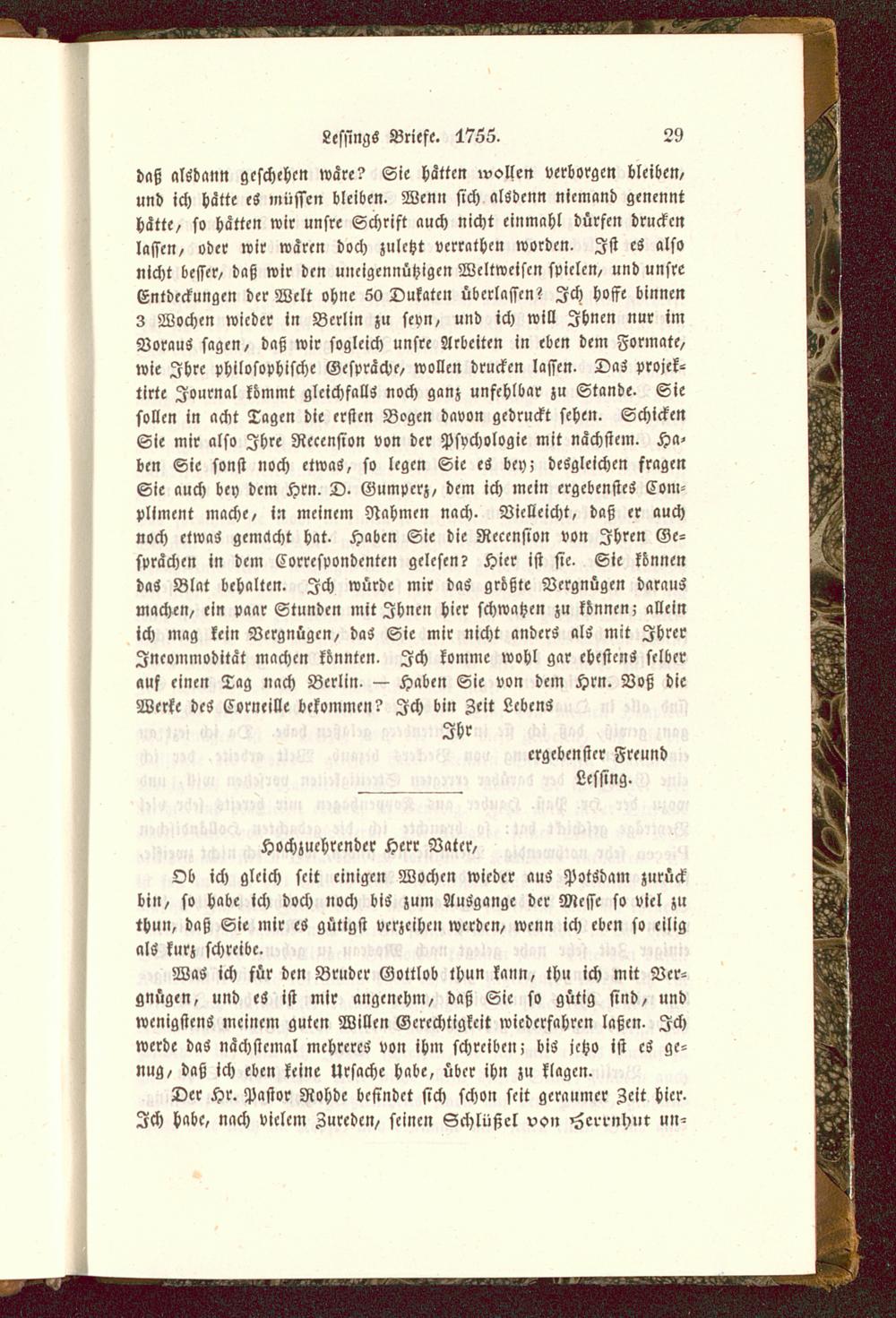 daß alsdann geschehen wäre? Sie hätten wollen verborgen bleiben/und ich hätte es müssen bleiben. Wenn sich alSdcnn niemand gcnennthätte, so hätten wir unsre Schrift auch nicht einmahl dürfen druckenlassen, oder wir wären doch zuletzt verrathen worden. Ist eS alsonicht besser, daß wir den uneigennützigen Weltweiscn spielen, und unsreEntdeckungen der Welt ohne 5o Dukaten überlassen? Ich hoffe binnen3 Wochen wieder in Berlin zu seyn, und ich will Ihnen nur imVoraus sagen, daß wir sogleich unsre Arbeiten in eben dem Formate,wie Ihre philosophische Gespräche, wollen drucken lassen. Das projek-tirte Journal kömmt gleichfalls noch ganz unfehlbar zu Stande. Siesollen in acht Tagen die ersten Bogen davon gedruckt sehen. SchickenSie mir also Ihre Recension von der Psychologie mit nächstem. Ha-ben Sie sonst noch etwas, so legen Sie es bey; desgleichen fragenSie auch bey dem Hrn. D- Gumpcrz, dem ich mein ergebenstes Com-pliment mache, in meinem Nahmen nach. Vielleicht, daß er auch»och etwas gemacht hat. Haben Sie die Recension von Ihren Ge-sprächen in dem Correspondenten gelesen? Hier ist sie. Sie könnendas Blat behalten. Ich würde mir das größte Vergnügen darausmachen, ein paar Stunden mit Ihnen hier schwatzen zu können; alleinich mag kein Vergnügen, das Sie mir nicht anders als mit IhrerJncommodität machen könnten. Ich komme wohl gar ehestens selberauf einen Tag nach Berlin . — Haben Sie von dem Hrn. Voß dieWerke des Corneille bekommen? Ich bin Zeit Lebens