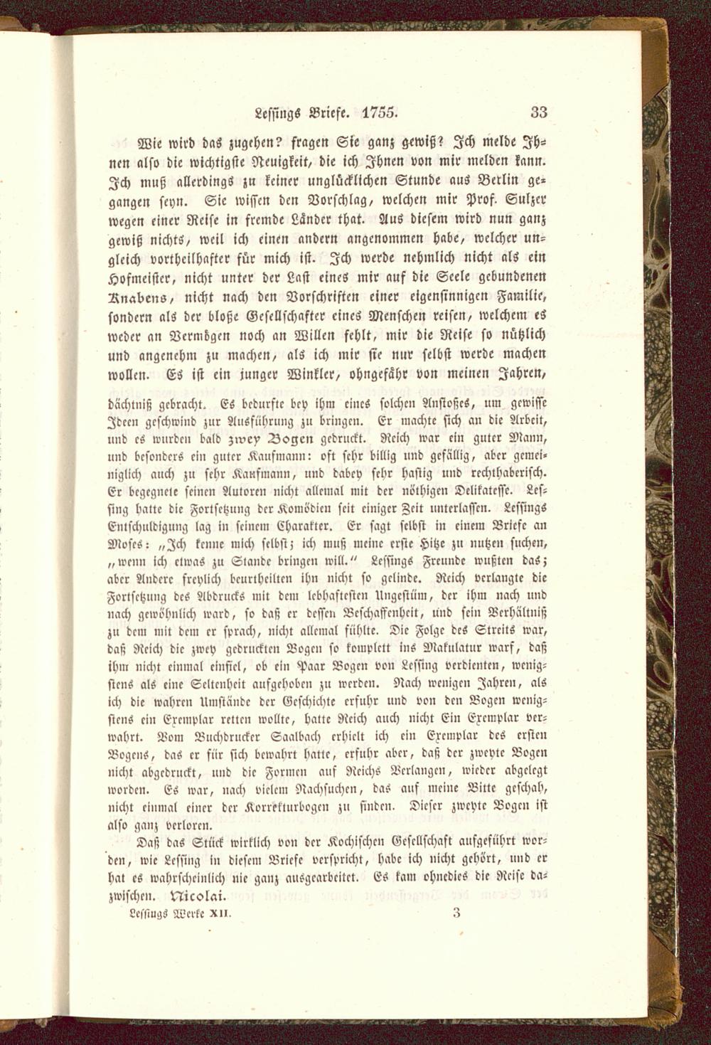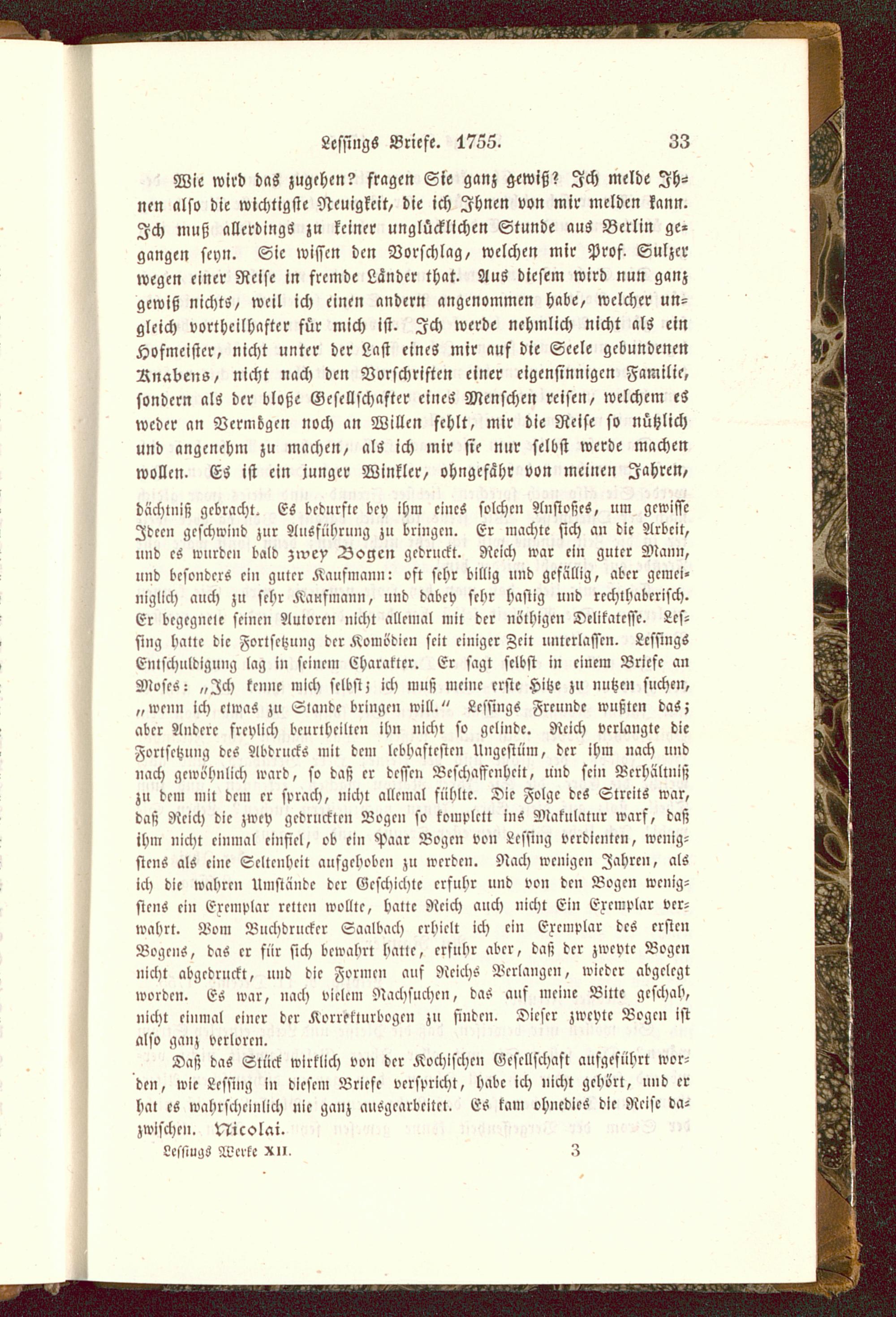 dächtniß gebracht. ES bedürfte bey ihm eines solche» Anstoßes, um gewisseIdeen geschwind zur Ausführung zu bringen. Er machte sich an die Arbeit,und es wurde» bald zivey Dogen gedruckt. Reich war ein guter Mann,und besonders ein guter Kaufmann: oft sehr billig und gefällig, aber gemei-niglich auch zu sehr Kaufmann, und dabey sehr hastig und rechthaberisch.Er bcgcgncle seinen Autoren nicht allemal mit der nöthigen Delikatesse. Lcs-sing baltc die Fortsetzung der Komödien seit einiger Zeit unterlassen. LcssingsEntschuldigung lag in seinem Charakter. Er sagt selbst in einem Briefe anMoses: „Zch kenne mich selbst; ich muß meine erste Hitze zu nutzen suche»,„wenn ich etwas zu Slaudc bringe» will." Lcssings Freunde wußten das;aber Andcrc freylich beurtheilten ihn nicht so gelinde. Rcich verlangte dieFortsetzung des Abdrucks mit dem lebhaftesten Ungestüm, der ihm »ach undnach gewöhnlich ward, so daß er dessen Beschaffenheit, und sein Verhältnißzu dem mit dem er sprach, nicht allemal fühlte. Die Folge des Streits war,daß Reich die zwey gedruckte» Böge» so komplett ins Makulatur warf, daßihm nicht einmal einfiel, ob ein Paar Bogen von Lcssing verdienten, wenig-stens als eine Seltenheit aufgehoben zu wrrdcn. Nach wenigen Jahre», alsich die wahre» Umstände der Geschichte erfuhr und von den Bogen wenig-stens ein Ercmplar retten wollte, Halle Rcich auch nicht Ein Ercmplar ver-wahrt. Bom Buchdruckcr Saalbach crhiclt ich ein Ez'cmplar dcs crstcnBogens, das er für sich bewahrt hatlc, crfubr abcr, daß dcr zwcvtc Bogcnnicht abgcdrnekl, und dic Formen auf Reichs Verlange», wicdcr abgclcgtworden. Es war, nach vielem Nachsuchen, das auf meine Bitte geschah,nicht einmal einer dcr Korreklurbogcn zu findcn. Dicscr zwcvtc Bogcn istalso ganz verloren.