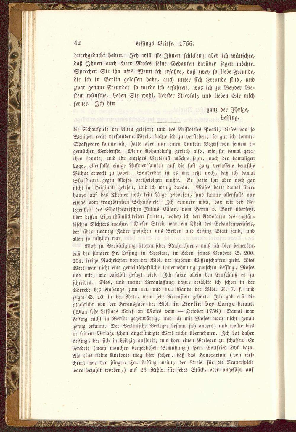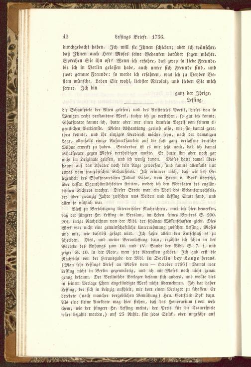 Bloß zu Berichtigung litterarischer Nachrichten, muß ich hier bemcrkcn,daß dcr jüngere Hr. Lcsstng in Breslau , im Leben seines Bruder« S. 200.201. irrige Nachrichten von dcr Bibl. dcr schönen Wissciischastc» giebt. DiesWerk war nicht eine gemeinschaftliche Unternehmung zwischen Lcsstng, Moses und mir, wie daselbst gesagt wird. Ich faßte allein den Entschluß es zuschreiben. Dies, und meine Vcraiilassung dazu, erzählte ich schon in derVorrede drs Anhangs zum m. und IV. Baude dcr Bibl. S. 7. f. undzeigte S. 10. in dcr Note, wem jede Recension gehört. Ich gab erst dieNachricht von der Herausgabe der Bibl. in Berlin bey Lange beraus.(Man sehe Lessings Brief an Moses vom — Octobcr 17S6) Damal warLcssing nicht in Berlin gegenwärtig, und ich mit Moses noch nicht genaugenug bekannt. Dcr Berlinische Verleger besann sich anders, und wollte diesin seinem Verlage schon angekündigte Werk nicht übernehmen. Ich bat daherLcssing, der sich in Leipzig aufhielt, »nr dort ri»c» Verleger z» schaffen. Erberedete (nach mancher vergeblichen Bemühung) Hrn. Gottfried Dvk dazu.Als eine kleine Anekdote mag hier stehe», daß das Honorariui» (von wel-che»!, wie dcr jüngere Hr. Lcssing meint, der Preis für die Trauerspielewäre bezahlt worden,) auf 25 Rthlr. für jedes Stück, oder ungefähr auf