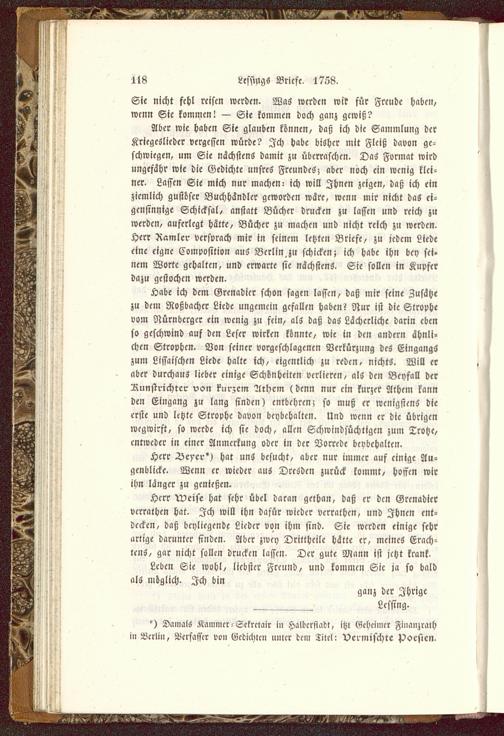 Äabc ich dem Grenadier schon sagen lassen, daß mir seine Zusätzezu dem Roßbachcr Liede ungemcin gefallen haben? Nur ist die Strophevom Nürnberger ein wenig zu fein, als daß das Lächerliche darin ebenso geschwind auf den Leser wirken könnte, wie in den ander» ähnli-chen Strophen. Von seiner vorgeschlagenen Verkürzung des Eingangszum Lissaischen Liede halte ich, eigentlich zu reden, nichts. Will eraber durchaus lieber einige Schönheiten verlieren, als den Beyfall derRunstrichtcr von kurzem Athem (denn nur ein kurzer Athem kannden Eingang zu lang finden) entbehren; so muß er wenigstens dieerste und letzte Strophe davon beybehalten. Und wenn er die übrigenwegwirft, so werde ich sie doch, allen Schwindsüchtigen zum Trotze,entweder in einer Anmerkung oder in der Vorrede beybehalten.
