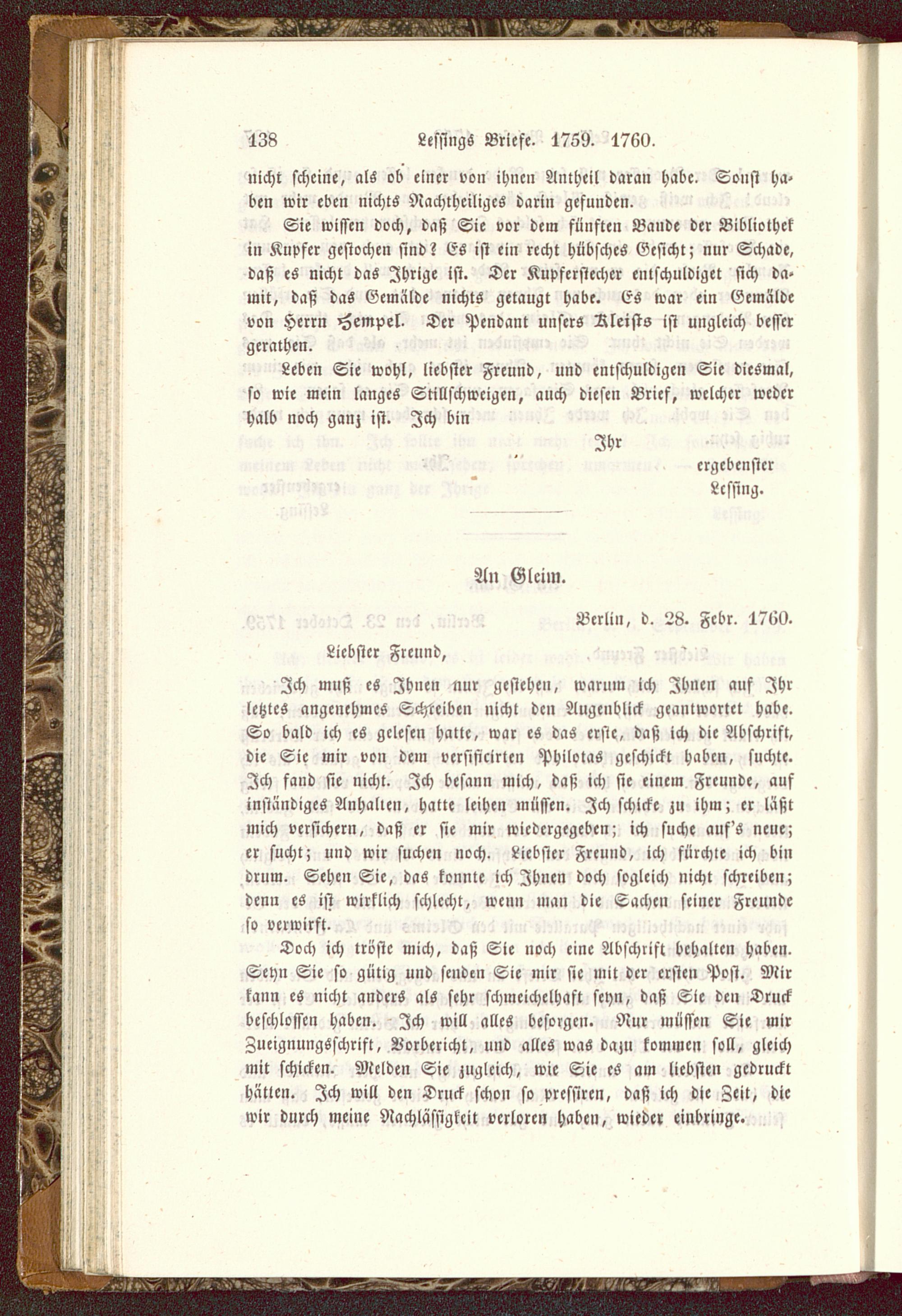 Ich muß es Ihnen nur gesteheu, warum ich Ihnen auf Ihrletztes angenehmes Schreiben nicht den Augenblick geantwortet habe.So bald ich es gelesen hatte, war es das erste, daß ich die Abschrift,die Sie mir von dem versificirten PhilolaS geschickt haben, suchte.Ich fand sie nicht. Ich besann mich, daß ich sie einem Freunde, aufinständiges Anhalten, hatte leihen müssen. Ich schicke ju ihm; er läßtmich versichern, daß er sie mir wiedergegeben; ich suche auf's neue;er sucht; und wir suchen noch. Liebster Freund, ich fürchte ich bindrum. Sehen Sie, das konnte ich Ihnen doch sogleich nicht schreiben;denn es ist wirklich schlecht, wenn man die Sachen seiner Freundeso verwirft.