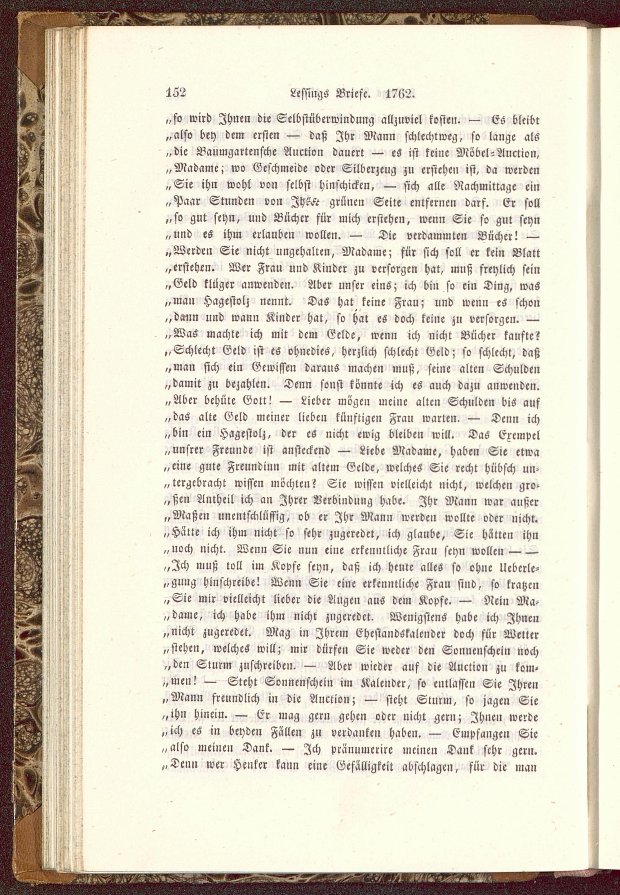 „Ich muß toll im Kopfe seyn, daß ich heute alles so ohne Ueberle-„gung hinschreibe! Wenn Sie eine erkenntliche Frau sind, so kratze»„Sie mir vielleicht lieber die Augen aus dem Kopfe. — Nein Ma-„dame, ich habe ihm nicht zugeredet. Wenigstens habe ich Ihnen„nicht zugeredet. Mag in Ihrem Ehestandskalender doch für Wetter„stehen, welches will; mir dürfen Sie weder den Sonnenschein noch„den Sturm zuschreiben. — Aber wieder auf die Auclion zu kom-„men! — Steht Sonnenschein im Kalender, so entlassen Sie Ihren„Mann freundlich in die Auction ; — steht Sturm, so jagen Sie„ihn hinein. — Er mag gern gehen oder nicht gern; Ihnen werde„ich es in beyden Fällen zu verdanken haben. — Empfangen Sie„also meinen Dank. — Ich präuumerire meinen Dank sehr gern.„Denn wer Henker kaun eine Gefälligkeit abschlage», für die man