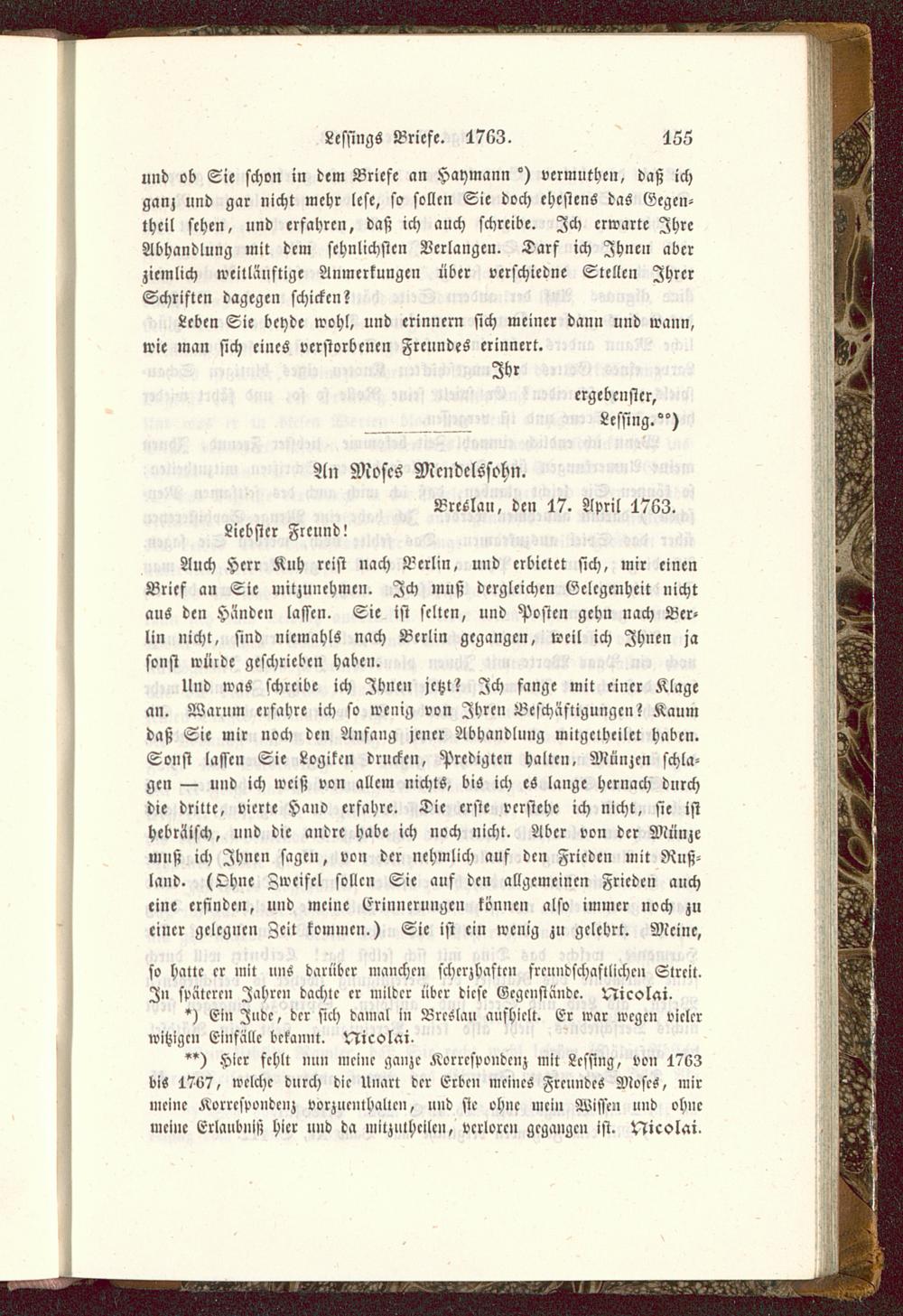 ") Hier fehlt mm nieinc ganze Korrespondenz mit Lcssing, von 1763bi« 17t>7, welche durch die Unart der Erben meines Freundes Moses, mirmeine Korrespondenz vorzucntbalic», und sie ohne mein Wissen und ohnemeine Erlaubniß hier und da niitzulhcilc», verloren gegangen ist. Nicolai,