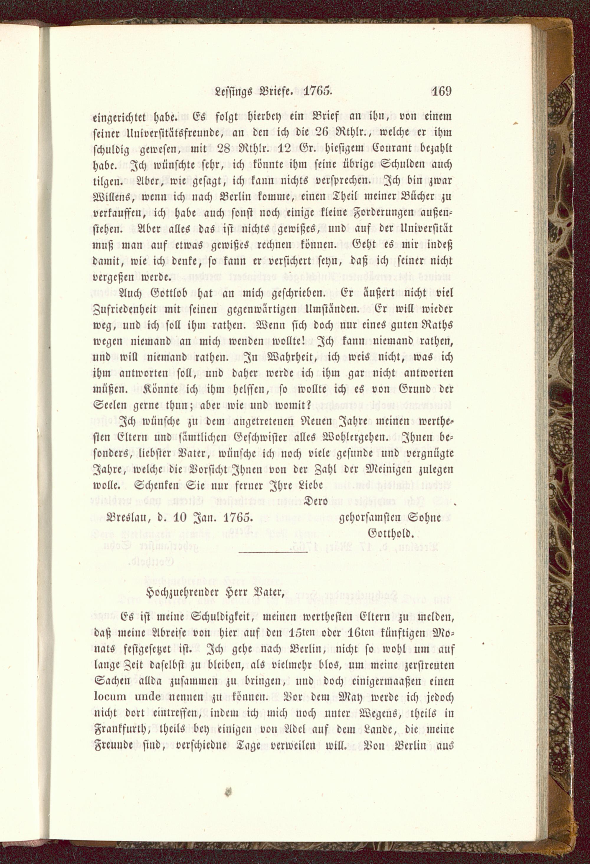 Es ist meine Schuldigkeit, meinen werthesten Eltern zu melden,daß meine Abreise von hier auf den IZtcn oder 16tc» künftigen Mo-nats festgesetzet ist. Ich gehe nach Berlin , nicht so wohl um auflange Zeit daselbst zu bleiben, als vielmehr blos, um meine zerstreutenSachen allda zusammen zu bringen, und doch cinigcrmaaßen einenlooum uucle nennen zu können. Vor dem May werde ich jedochnicht dort eintreffen, indem ich mich noch unter WegcnS, theils inFrankfurt !), theils bey einigen von Adel auf dem Lande, die meineFreunde sind, verschiedne Tage verweilen will. Von Berlin aus