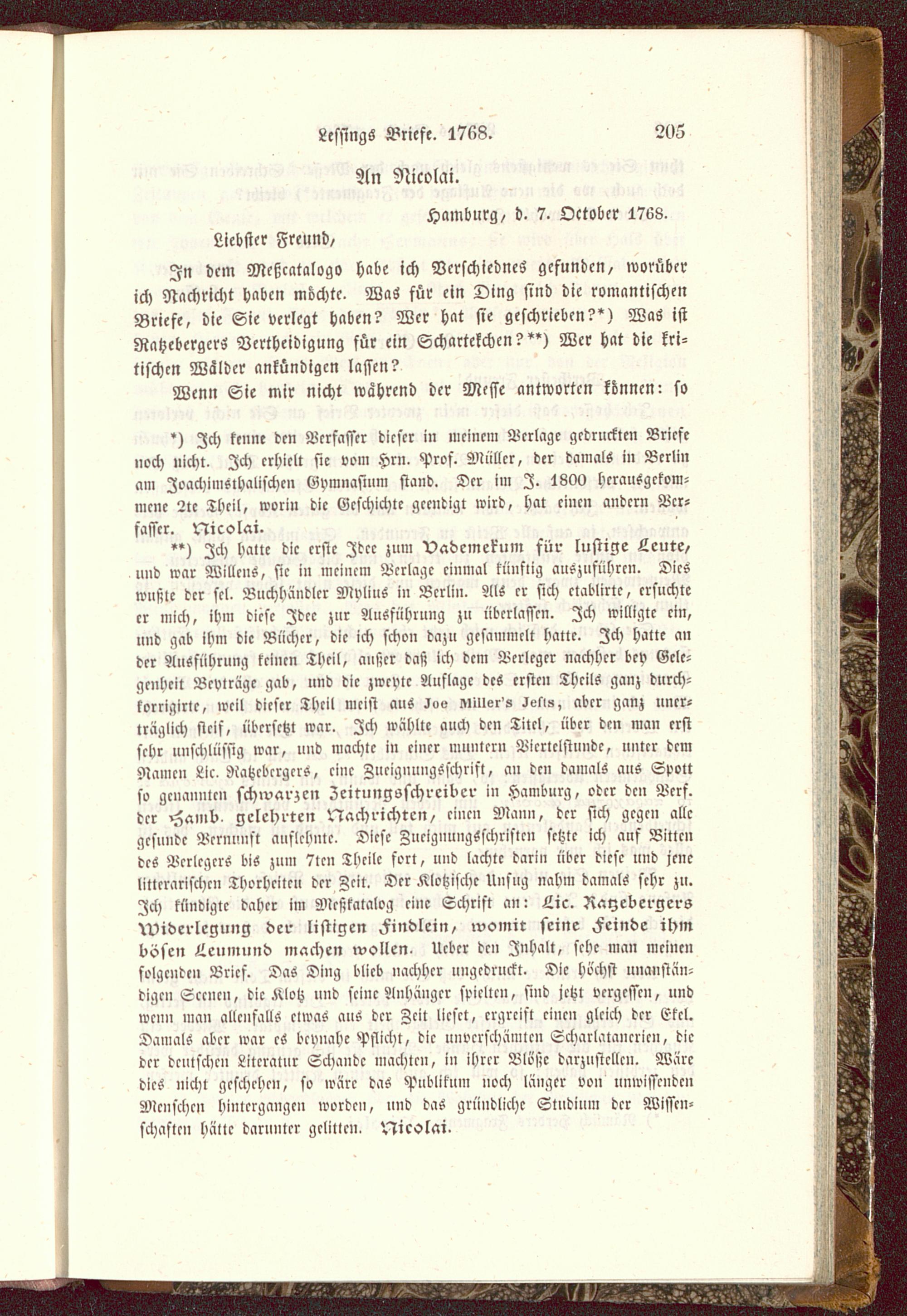 ") Ich halte die erste Idee zum Vademekum für lustige Leute/und war Willens, sie in meinem Verlage einmal künftig auszuführen. Dieswusuc der sel. Buchhändler Mvlius in Berlin . Als er sich clablirte, ersuchteer mich, ihm diese Idee zur Ausführung zu überlassen. Ich willigle ein,nnd gab ihm die Bücher, die ich schon dazu gesammelt Halle. Ich halte auder Ausfübrung keinen Tl'cil, auszcr daß ich dem Verleger nachher bcv Gele-gcnhcit Bcvtragc gab, und die zwevlc Auflage des ersten Theils ganz durch-korrigirlc, weil dieser Theil meist aus ^v>- i»iiler's ^ek>», aber ganz uner-lräglich steif, übersetzt war. Ich wählte auch den Tilel, über den man erstscdr unschlüssig war, und machte i» einer munlern Viertelstunde, unter demNamen Lic, Ratzcbergcrs, cinc Zucignungsschrifl, an dcn damals aus Spottso gcnannlcn schwarzen Zeitungsschreiber in Hamburg , odcr dcn Verf.der Hamb gelehrten Nachrichten/ einen Mann, der sich gegen allegesunde Vernunft aufleimte. Diese Zueignungsschristcn setzte ich ans Bitte»des Verlegers bis zum 7tcn Theile forl, und lachte darin über diese und jenelitterarischen Thorhcitc» der Zcit. Dcr Klotzischc Unfug nalmi damals sehr zu.Ich kündigte daher im Mckkatalog eine Schrift an: Lic. Rayebergcrs^Viderlcgung dcr listigen Findlcin, womit seine Feinde ihmbösen Leumund machen wollen. Ueber den Inhalt, sclie mau meinenfolgenden Brief. Das Ding blieb nachher ungedruckt. Dic höchst uuanstän-digcn Scenen, dic .Klotz und scinc Anhänger spicllcn, sind jetzt vcrgcsscn, undwcnn man allcufalle! clwas aus dcr Zcit licsct, ergreift einen gleich der Ekel.Damals aber war es bcvnahe Pflicht, dic unocrschämlcn Scharlatanerie», dicder dculschcu Literatur Schande machtcn, in ihrer Blöße darzustcllcu. Waredies nicht geschehen, so wäre das Publikum noch länger von unwissendenMenschen hintcrgangcn worden, und das gründliche Sludium dcr Wissen-schaften hätte darunter gelitten. Nicolai.