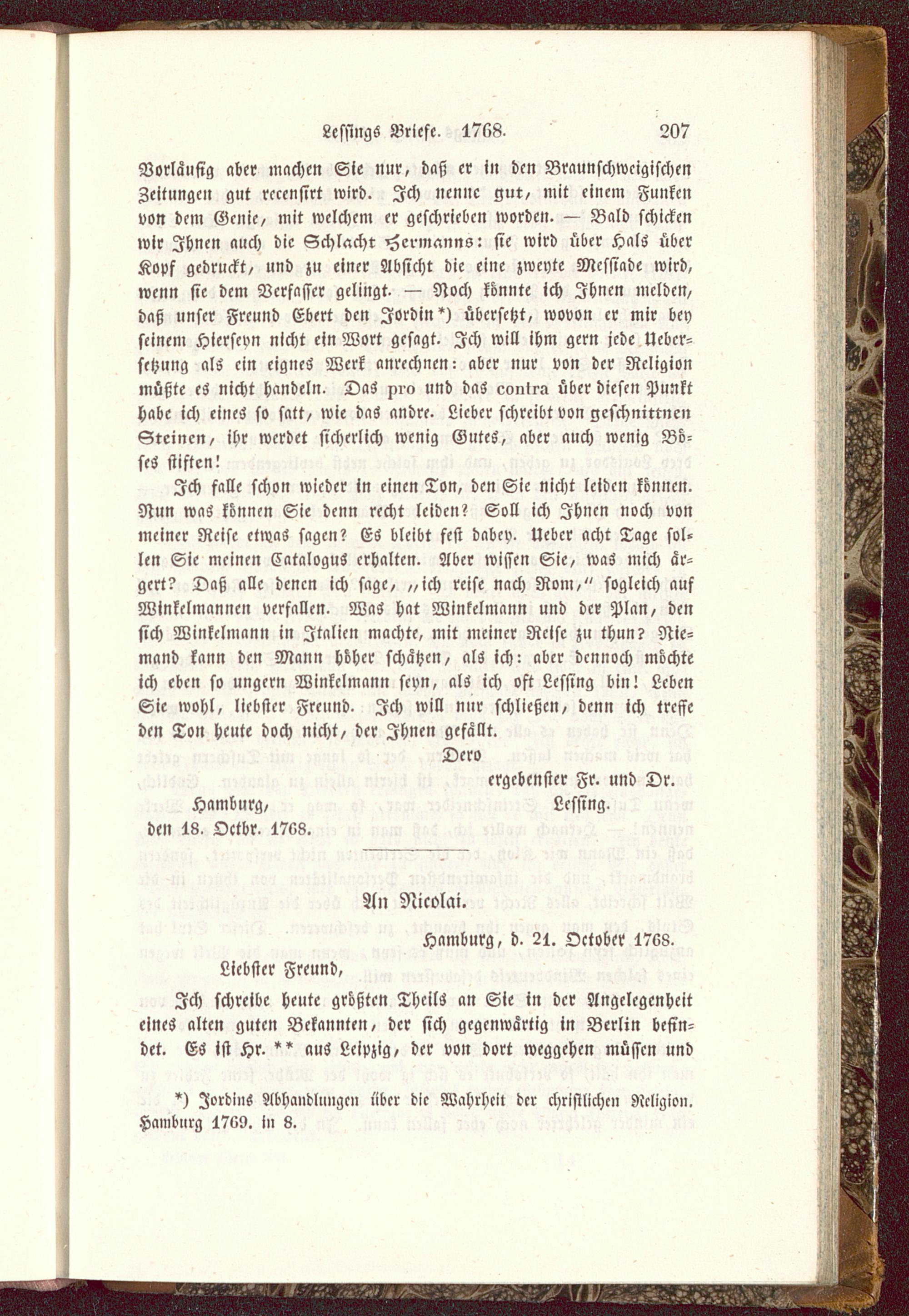 Ich falle schon wieder in einen Ton, den Sie nicht leiden können.Nun was können Sie denn recht leiden? Soll ich Ihnen noch vonmeiner Reise etwas sagen? ES bleibt fest dabey. Ueber acht Tage sol-len Sie meinen CataloguS erhalten. Aber wissen Sie, waS mich är-gert? Daß alle denen ich sage, „ich reise nach Rom, " sogleich aufWInkelmanncn verfallen. Was hat Winkelmann und der Plan/ densich Winkclmann in Italien machte, mit meiner Reise zu thun? Nie-mand kann den Mann höher schätzen/ als ich: aber dennoch möchteich eben so ungern Winkclmann seyn, als ich oft Lessing bin! LebenSie wohl, liebster Freund. Ich will nur schließen, denn ich treffeden Ton heute doch nicht/ der Ihnen gefällt.