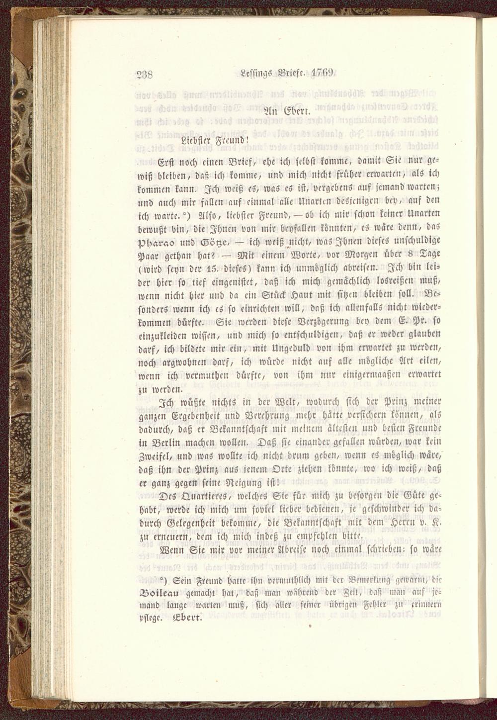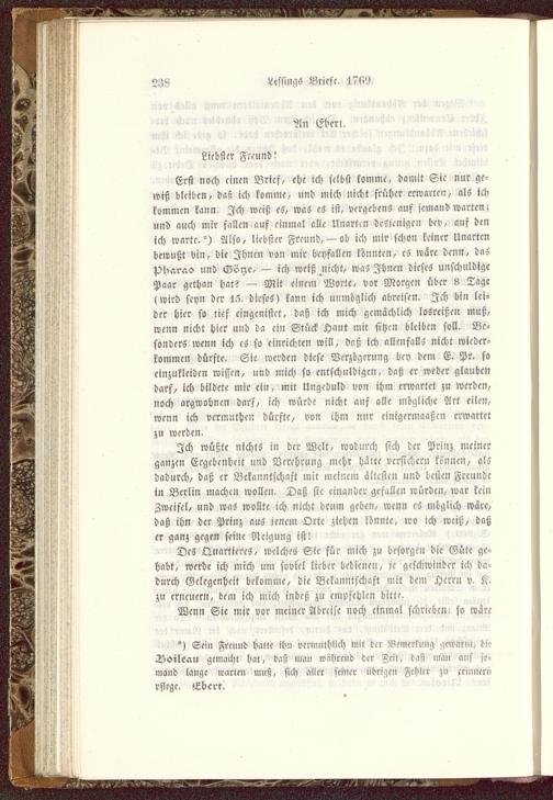 Erst »och einen Brief, ehe ich selbst komme, damit Sie nur ge-wiß bleiben, das? ich komme, »nd mich nicht früher erwarte», als ichkommen kann. Ich weiß cS, was es ist, vergebens anf jemand warten;und auch mir fallen auf einmal alle Unarten desjenigen bcv, auf denich warte. °) Also, liebster Freund,— ob ich mir schon keiner Unartenbewußt bin, die Ihnen von mir bcyfallen konnten, es war- denn, dasPharao und Göyc, — ich weiß nicht, was Ihnen dieses unschuldigePaar gethan hat? — Mit einem Worte, vor Morgen über 8 Tage(wird seyn der 15, dieses) kann ich unmöglich abreisen. Ich bin lei-der hier so tief eingenistet, daß ich mich gemächlich losreiße» muß,wenn nickt hier und da ein Stück Haut mit sihen bleiben soll. Be-sonder» wenn ich cS so einrichten will, daß ich allenfalls nicht wieder-kommen dürfte. Sie werden diese Verzögerung bey dem E. Pr. soeinzukleiden wissen, und mich so entschuldigen, daß er weder glaubendarf/ ich bildete mir ein, mit Ungeduld von ihm erwartet zu werde»,noch argwohnen darf, ich würde nicht auf alle mögliche Ärt eilen,wenn ich vermuthen dürfte, von ihm mir einigermaaßcn erwartetzu werden.