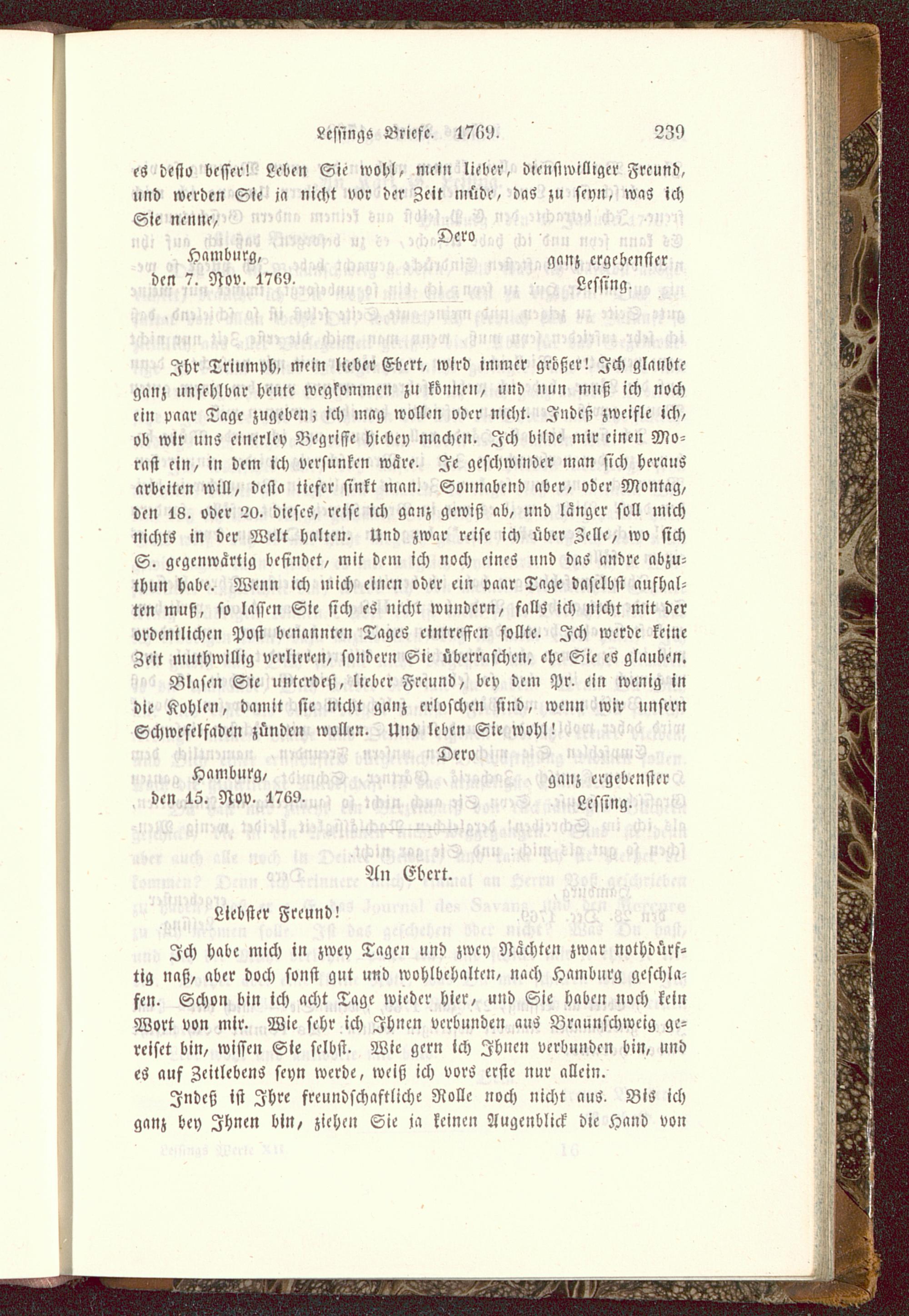 Ihr Triumph, mein lieber Ebcrt, wird immer großer! Ich glaubteganz unfehlbar heute wegkommen zu können, und nun muß ich nochein paar Tage zugeben; ich mag wollen oder nicht- Indeß zweifle ich,ob wir uns cincrlcv Begriffe hicbcy machen. Ich bilde mir einen Mo-rast ein, in dem ich versunken wäre- Je geschwinder man sich herausarbeiten will, desto tiefer sinkt man. Sonnabend aber, oder Montag,den 18. oder W. dieses, reise ich ganz gewiß ab, und langer soll michnichts in der Welt halten. Und zwar reise ich über Zelle, wo sichS. gegenwärtig befindet, mit dein ich noch eines und das andre abzu-thun habe. Wenn ich mich einen oder ein paar Tage daselbst aufhal-ten muß, so lassen Sie sich es nicht wundern, falls ich nicht mit derordentlichen Post benannten TageS eintreffen sollte. Ich werde keineZeit muthwillig verlieren, sondern Sie überraschen, ehe Sie cS glauben.