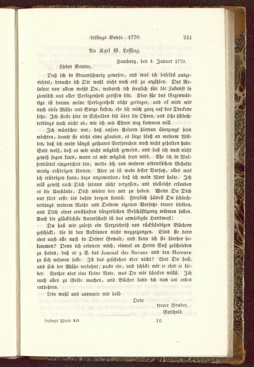 Ich wünschte nur, daß unsere Aeltcrn hiervon überzeugt seynmöchten, damit sie nicht etwa glauben, cS liege bloß an meinem Wil-len, daß ich mein längst gethanes Versprechen noch nicht gehalten habe.Gott weiß, daß es mir nicht möglich gewesen, und daß ich noch nichtgewiß sagen kann, wann es mir möglich seyn wird. Ehe ich in Wol-fcnbüttcl eingerichtet biii/ werde ich von meinem ordentlichen Gehaltewenig erübrigen können. Aber es ist mein fester Vorsatz, alles wasich erübrigen kann/ dazu anzuwenden, daß ich mein Wort halte. Ichwill gewiß auch Dich sodann nicht vergessen, und vielleicht erlaubenes die Umstände, Dich wieder bey mir zu haben. Wenn Du Dichnur fürs erste bis dahin bergen kannst. Freylich hättest Du schlech-terdings meinem Rathe und Deinem eigenen Vorsätze treuer bleiben,und Dich einer ernsthaften bürgerlichen Beschäftigung widmen sollen.Auch die glücklichste Autorschaft ist das armseligste Handwerk!