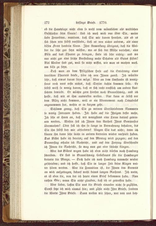 Aber des Billets wegen habe ich eben nicht dürfen nach Hamburg schreiben. Es sind in Braunschweig Cvllckteurs für die HamburgerLotterie die Menge. — Doch habe ich nach Hamburg nunmehr wiedergeschrieben; und ich hoffe, daß Sie in langer Zeit keine Klagen wei-ter hören werden. Wer die Freundinn ist, die Ihnen den Verweisan mich aufgetragen, bedarf wohl keines langen RathenS. Ich wette,cS ist eben die, von der ich heute einen Brief bekommen habe. Nunrathen Sie; wenn Sie nicht glauben, daß ich es getroffen habe.