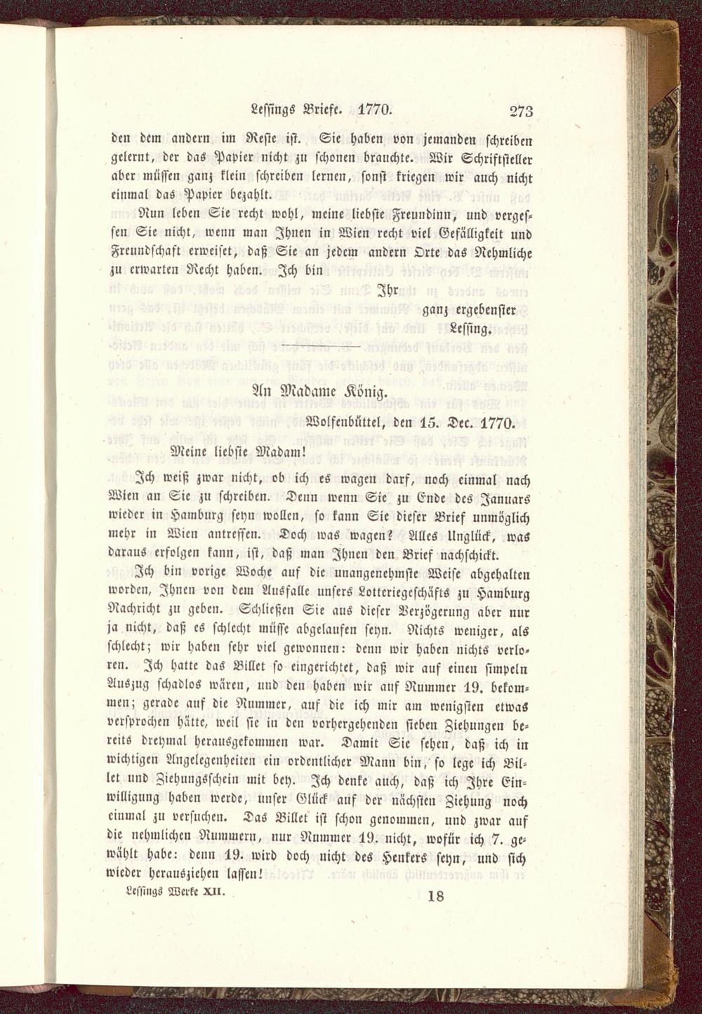 Ich bin vorige Woche auf die unangenehmste Weise abgehaltenworden, Ihnen von dem Ausfalle unsers Lotlcriegcschäfts zu Hamburg Nachricht zu geben. Schließen Sie aus dieser Verzögerung aber nurja nicht, daß es schlecht müsse abgelaufen seyn. Nichts weniger, alsschlecht; wir haben sehr viel gewonnen: denn wir haben nichts verlo-ren. Ich halte das Billet so eingerichtet, daß wir auf einen simpelnAuszug schadlos waren, und den haben wir ans Nummer 19. bekom-men; gerade auf die Nummer, auf die ich mir am wenigsten etwasversprochen hätte, weil sie in den vorhergehenden sieben Ziehungen be-reits dreymal herausgekommen war. Damit Sie sehen, daß ich inwichtigen Angelegenheiten ein ordentlicher Mann bin, so lege ich Bil-let und ZiehungSschcin mit bey. Ich denke auch, daß ich Ihre Ein-willigung haben werde, unser Glück auf der nächsten Ziehung nocheinmal zu versuche». Das Billet ist schon genommen, und zwar aufdie nehmlichen Nummern, nur Rummer 19. nicht, wofür ich 7. ge-wählt habe: denn 19. wird doch nicht des Henkers seyn, und sichwieder herausziehen lassen!