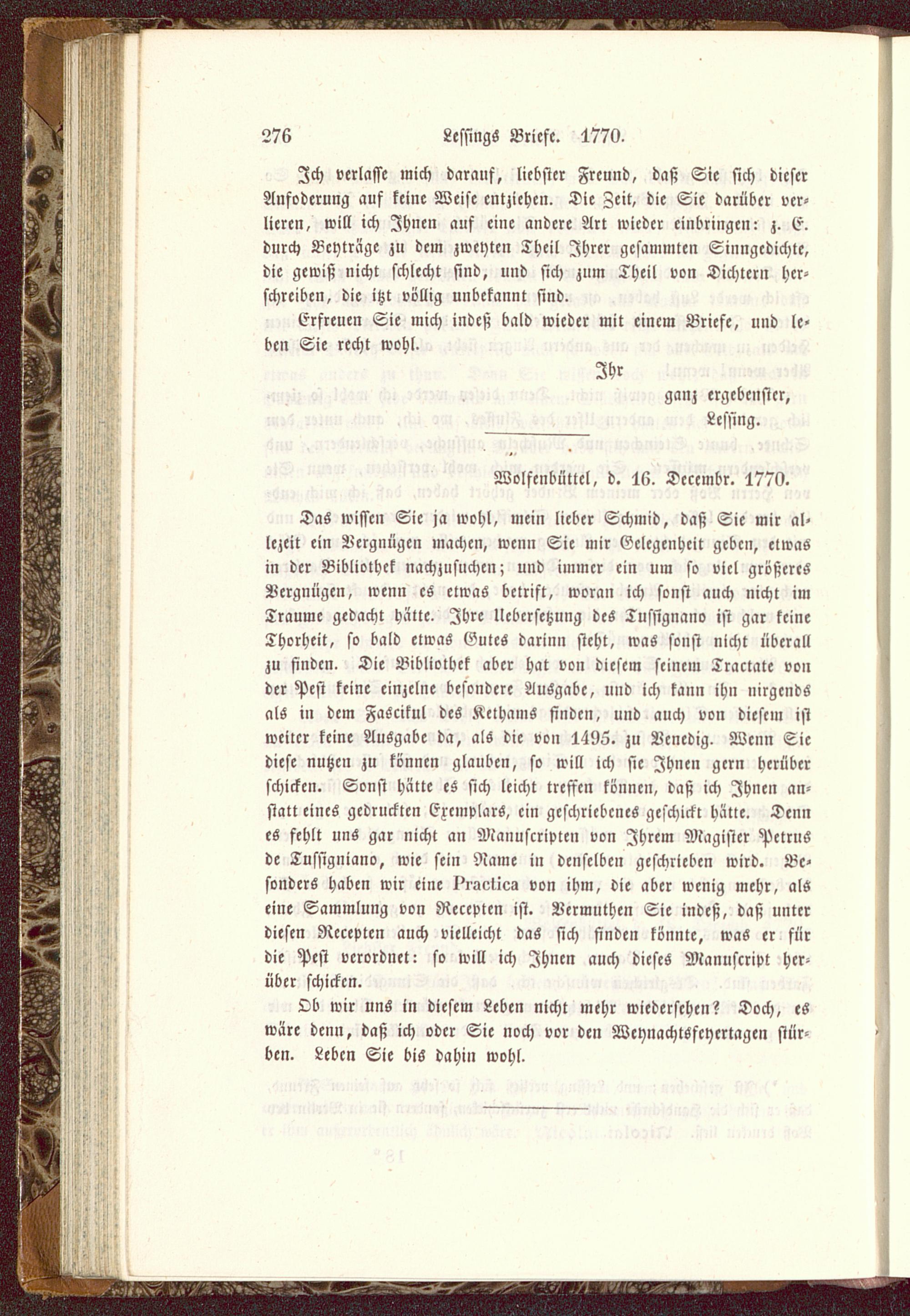 Das wissen Sie ja wohl, mein lieber Schmid, daß Sie mir al-lezeit ein Vergnügen machen, wenn Sie mir Gelegenheit geben, etwasin der Bibliothek nachzusuchen; und immer ein um so viel größeresVergnügen, wenn es etwas betrift, woran ich sonst auch nicht imTraume gedacht hatte. Ihre llebersetznng des Tussignano ist gar keineThorheit, so bald etwas Gutes darum steht, was sonst nicht überallzu finden. Die Bibliothek aber hat von diesem seinem Tractate vonder Pest keine einzelne besondere Ausgabe, und ich kann ihn nirgendsals in dem Zascikul des KelhamS finden, und auch von diesem istweiter keine Ausgabe da, als die von 1495. zu Venedig. Wenn Siediese nutzen zu können glauben, so will ich sie Ihnen gern herüberschicke». Sonst hätte es sich leicht treffen können, daß ich Ihnen an-statt eines gedruckten <?rc»ivlars, ein geschriebenes geschickt hätte. Dennes fehlt uns gar nicht an Manuscriplen von Ihrem Magister Petrusde Tussigniano, wie sein Name in denselben geschrieben wird. Be-sonders haben wir eine I'i'aotiea von ihm, die aber wenig mehr, alseine Sammlung von Recepten ist. Vermuthen Sie indeß, daß unterdiesen Recepten auch vielleicht das sich finden könnte, was er fürdie Pest verordnet: so will ich Ihnen auch dieses Manuscript her-über schicken.