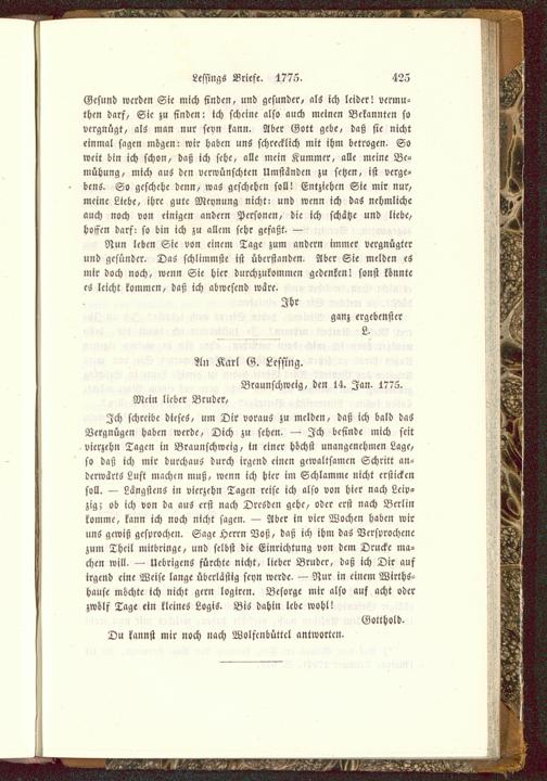 Ich schreibe dieses, um Dir voraus zu melden, daß ich bald dasVergnügen haben werde, Dich zu sehen. — Ich befinde mich seitvierzehn Tagen in Braunschwcig, tn einer höchst unangenehmen Lage,so daß ich mir durchaus durch irgend einen gewaltsamen Schritt an-derwärts Luft machen muß, wenn ich hier im Schlamme nicht erstickensoll. — Längstens in vierzehn Tagen reise ich also von hier nach Leip-zig; ob ich von da aus erst nach Dresden gehe, oder erst nach Berlin komme, kann ich noch nicht sagen. — Aber in vier Wochen haben wiruns gewiß gesprochen. Sage Herrn Voß, daß ich ihm das Versprochenezum Theil mitbringe, und selbst die Einrichtung von dem Drucke ma-chen will. — UebrigcnS fürchte nicht, lieber Bruder, daß ich Dir aufirgend eine Weise lange übcrlästig seyn werde. — Nur in einem Wirths-hanse möchte ich nicht gern logiren. Besorge mir also auf acht oderzwölf Tage ein kleines LogiS. Bis dahin lebe wohl!