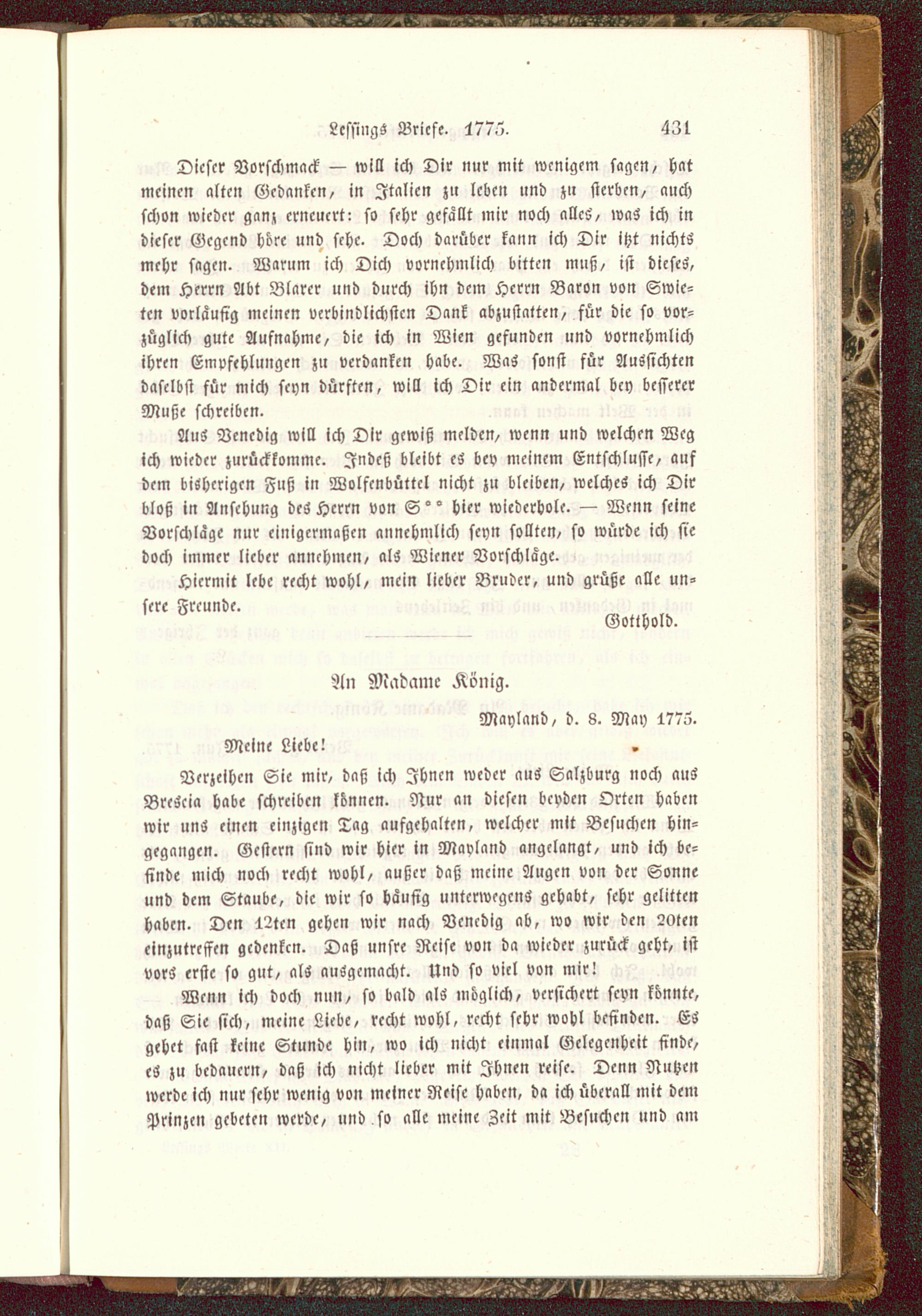 Verzeihen Sie mir, daß ich Ihnen weder aus Salzburg noch ausBrescia habe schreiben können. Nur an diesen beyden Orten habenwir uns einen einzigen Tag aufgehalten, welcher mit Besuchen hin-gegangen. Gestern sind wir hier in Mavland angelangt, und ich be-finde mich nock recht wohl, außer daß meine Augen von der Sonneund dem Staube, die wir so häufig untcrwegcnS gehabt, sehr gelittenhaben. Den 12tcn gehen wir nach Venedig ab, wo wir den 20lcneinzutreffen gedenken. Daß unsre Reise von da wieder zurück geht, istVorS erste so gut, als ausgemacht. Und so viel von mir!
