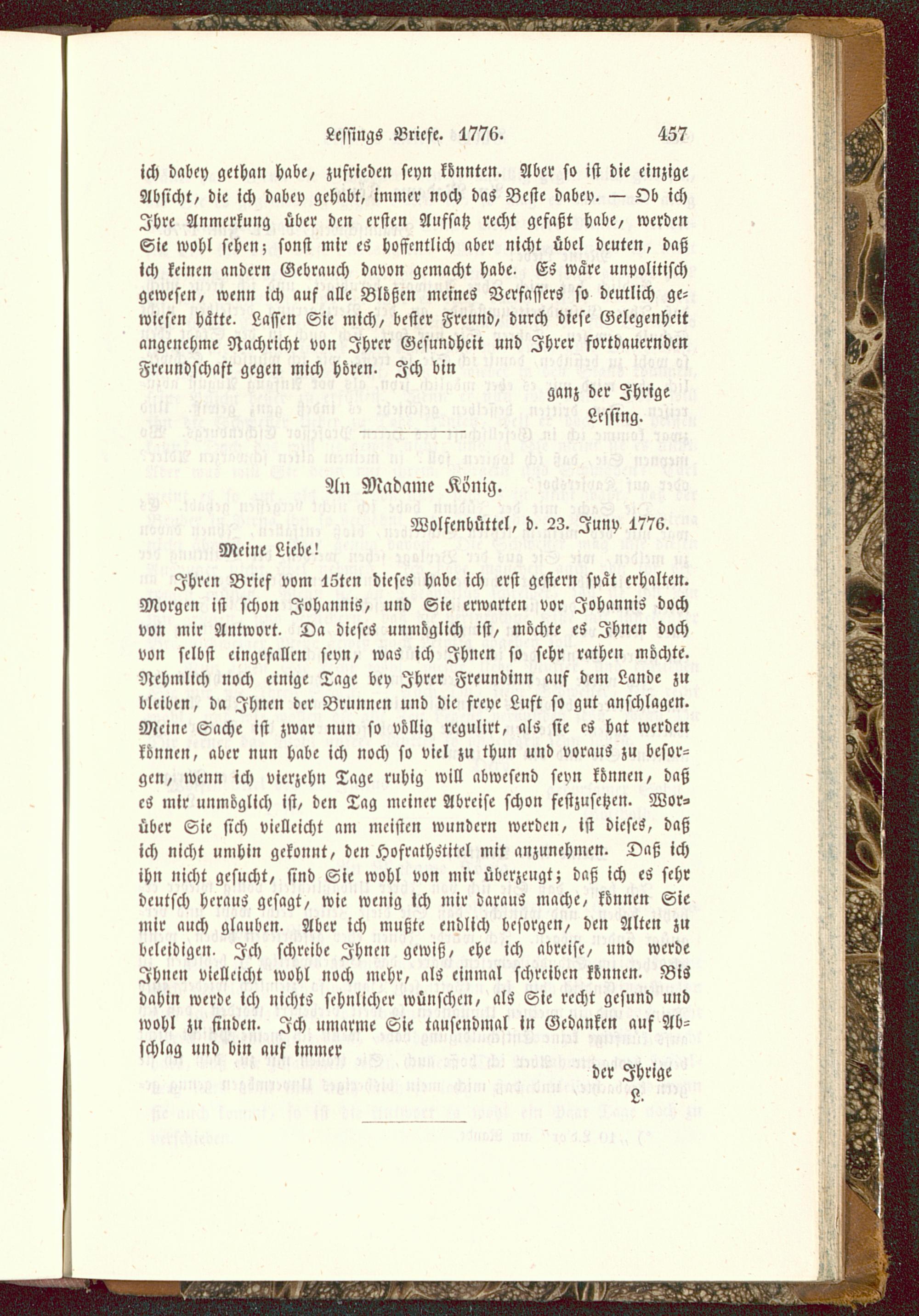Ihren Brief vom 15tcn dieses habe ich erst gestern spät erhalten.Morgen ist schon Iohannis, und Sie erwarten vor Iohannis dochvon mir Antwort. Da dieses unmöglich ist, möchte es Ihnen dochvon selbst eingefallen seyn, was ich Ihnen so sehr rathen möchte.Nehmlich noch einige Tage bey Ihrer Freundinn auf dem Lande zubleiben, da Ihnen der Brunnen und die freye Luft so gut anschlagen.Meine Sache ist zwar nun so völlig rcgulirt, als sie cS hat werdenkönnen, aber nun habe ich noch so viel zu thun und voraus zu besor-gen, wenn ich vierzehn Tage ruhig will abwesend scvn können, daßcS mir unmöglich ist, den Tag meiner Abreise schon festzusetzen. Wor-über Sie sich vielleicht am meisten wundern werden, ist dieses, daßich nicht umhin gekonnt, den Hofcathstitcl mit anzunehmen. Daß ichihn nicht gesucht, sind Sie wohl von mir überzeugt; daß ich cS sehrdeutsch heraus gesagt, wie wenig ich mir daraus mache, können Siemir auch glauben. Aber ich mußte endlich besorgen, den Alten zubeleidigen. Ich schreibe Ihnen gewiß, ehe ich abreise, und werdeIhnen vielleicht wohl noch mehr, als einmal schreiben können. Bisdahin werde ich nichts sehnlicher wünschen, als Sie recht gesund undwohl zu finden. Ich umarme Sie tausendmal in Gedanken auf Ab-schlag und bin auf immer
