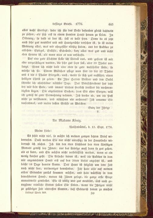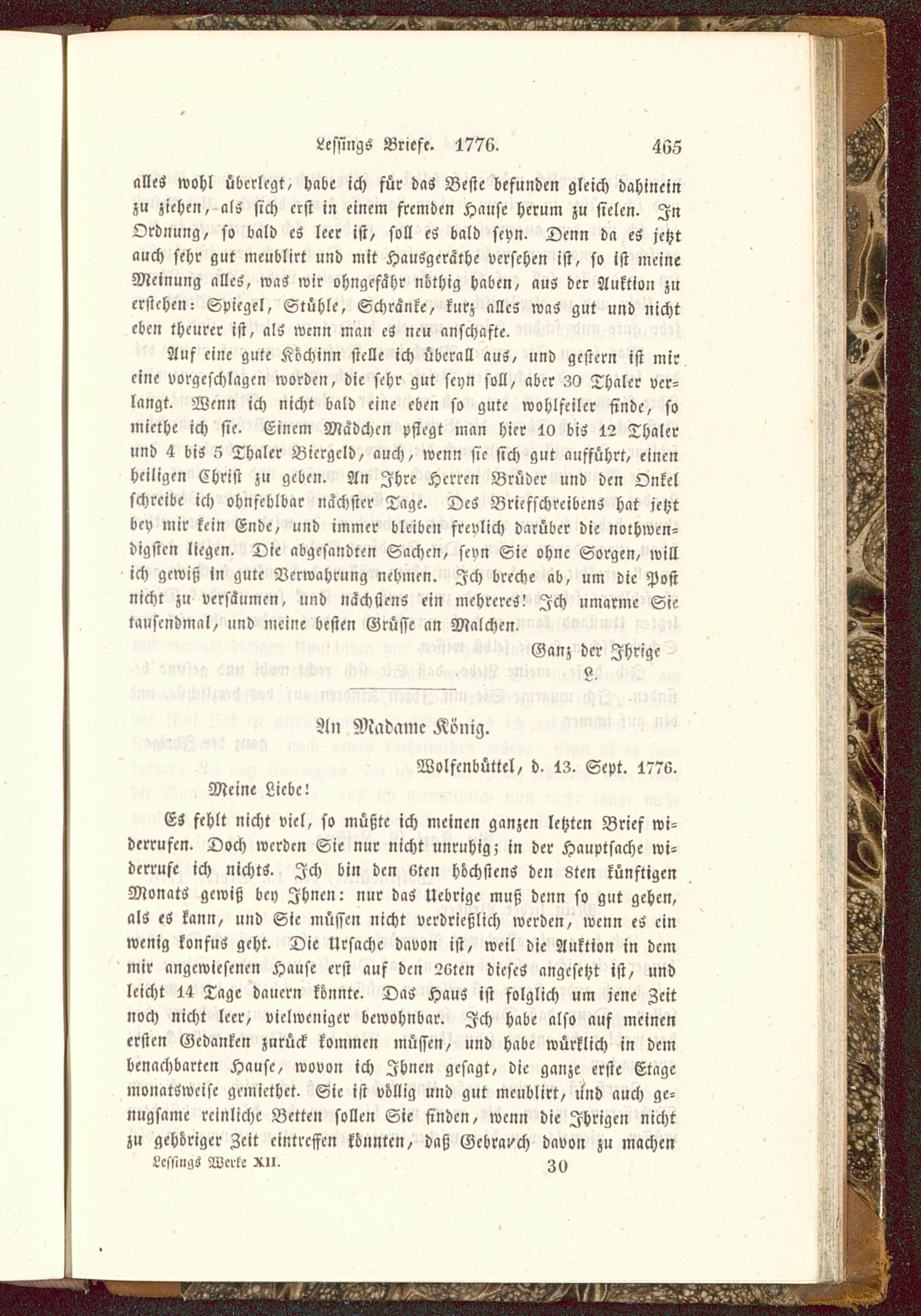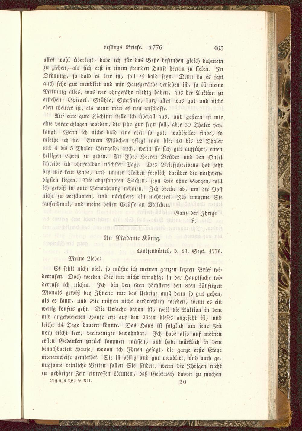ES fehlt nicht viel, so müßte ich meinen ganzen letzten Brief wi-derrufen. Doch werden Sie nur nicht unruhig; in der Hauptsache wi-derrufe ich nichts. Ich bin den 6ten höchstens den 8ten künftigenMonatS gewiß bey Ihnen: nur das Ucbrigc muß denn so gut gehen,als eS kann, und Sie müssen nicht verdrießlich werden, wenn eS einwenig konfus geht. Die Ursache davon ist, weil die Auktion in demmir angewiesenen Hause erst auf den 2«ten dieses angesetzt ist, undleicht 14 Tage dauern konnte. DaS HauS ist folglich um jene Zeitnoch nicht leer, vielwcniger bewohnbar. Ich habe also auf meinenersten Gedanken zurück kommen müssen, und habe würklich in dembenachbarten Hause, wovon ich Ihnen gesagt, die ganze erste Etagemonatsweise gemiethet. Sie ist völlig und gut meublirt, lind auch ge-nügsame reinliche Betten sollen Sie finden, wenn die Ihrigen nichtzu gehöriger Zeit eintreffen könnten, daß Gebrauch davon zu machenLcsmigs Werk- xu. Zy