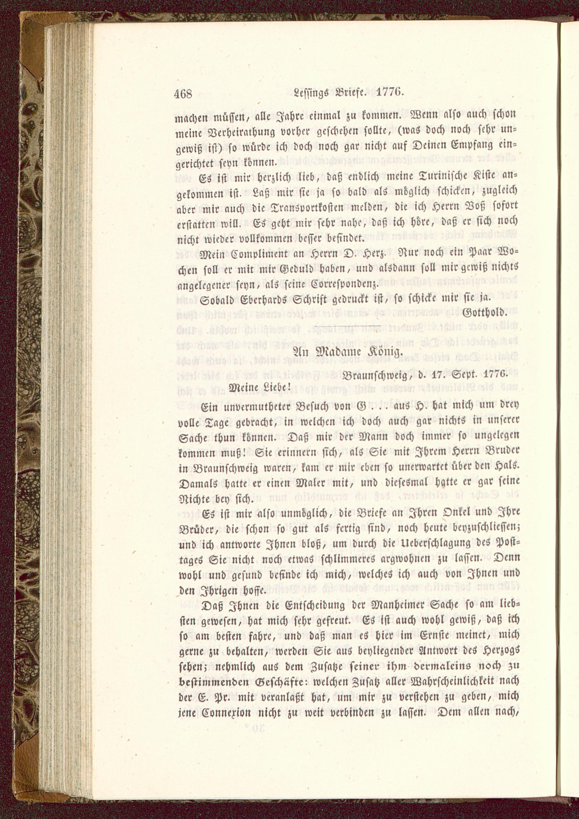 Ein unvcrmuthetcr Besuch von G . . - aus H. hat mich um dreyvolle Tage gebracht, in welchen ich dock) auch gar nichts in unsererSache thun können. Daß mir der Mann doch immer so ungelegenkommen muß! Sie erinnern sich, als Sie mit Ihrem Herrn Bruderin Braunschweig waren, kam er mir eben so unerwartet über den Hals.Damals hatte er einen Maler mit, und dieseSmal hatte er gar seineNichte bey sich.