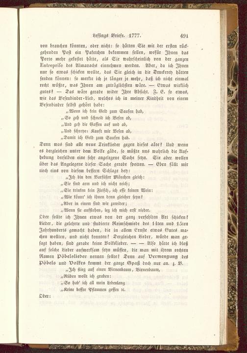 „Wenn sie aufstehe», leg ich mich erst nieder.5^der sollte ich Ihnen etwas von der ganz verfehlten Art schicken?Lieder, die gelehrte und studierte Reimschmiede des 14ten und 16tcnJahrhunderts gemacht haben, die in allem Ernste etwas Gutes ma-chen wollten, und nicht konnten? Dergleichen Lieder, würde man ge-sagt haben, sind gerade keine Volkslieder.--Also hätte ich bloß