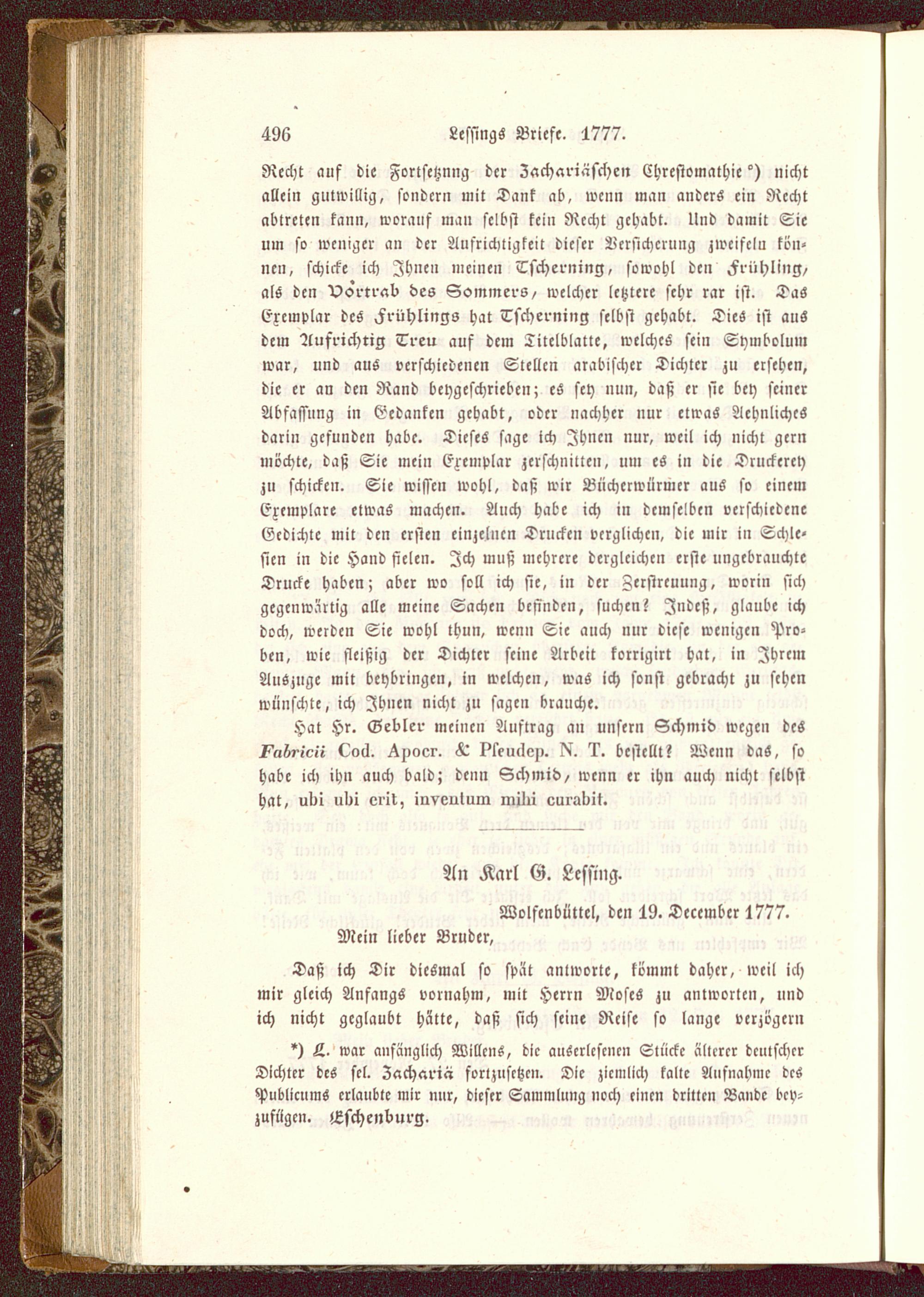 Recht auf die Fortsetzung der Zachariäschen Chrestomathie °) nichtallein gutwillig, sondern mit Tank ab, wenn man anders ein Rechtabtreten kann, worauf mau selbst kein Recht gehabt. Und damit Sieum so weniger an der Aufrichtigkeit dieser Versicherung zweifeln kön-nen, schicke ich Ihnen meinen Tscherning, sowohl den Frühling/als den Vortrab des Sommers/ welcher letztere sehr rar ist. DasExemplar des Frühlings hat Tscherning selbst gehabt. Dies ist ausdem Aufrichtig Treu auf dem Titelblatte, welches sein Symbolumwar, und aus verschiedenen Stellen arabischer Dichter zu ersehen,die er an den Rand beygeschriebcn; eS sey nu», daß er ste bey seinerAbfassung in Gedanken gehabt, oder nachher nur etwas AehnlicheSdarin gefunden habe. Dieses sage ich Ihnen nur, weil ich nicht gernmöchte, daß Sie mein Exemplar zerschnitten, um es in die Druckerei)zu schicken. Sie wissen wohl, daß wir Bücherwürmer aus so einemExemplare etwas machen. Anch habe ich in demselben verschiedeneGedichte mit den ersten einzelucn Drucke» vergliche», die mir iu Schle-sien in die Hand fielen. Ich muß mehrere dergleichen erste ungebrauchteDrucke haben; aber wo soll ich sie, in der Zerstreuung, worin sichgegenwärtig alle meine Sachen befinden, suchen? Indeß, glaube ichdoch, werden Sie wohl thun, wenn Sie auch nur diese wenigen Pro-ben, wie fleißig der Dichter seine Arbeit korrigirt hat, in IhremAuszüge mit beybringen, in welchen, was ich sonst gebracht zu sehenwünschte, ich Ihnen nicht zu sage» brauche.