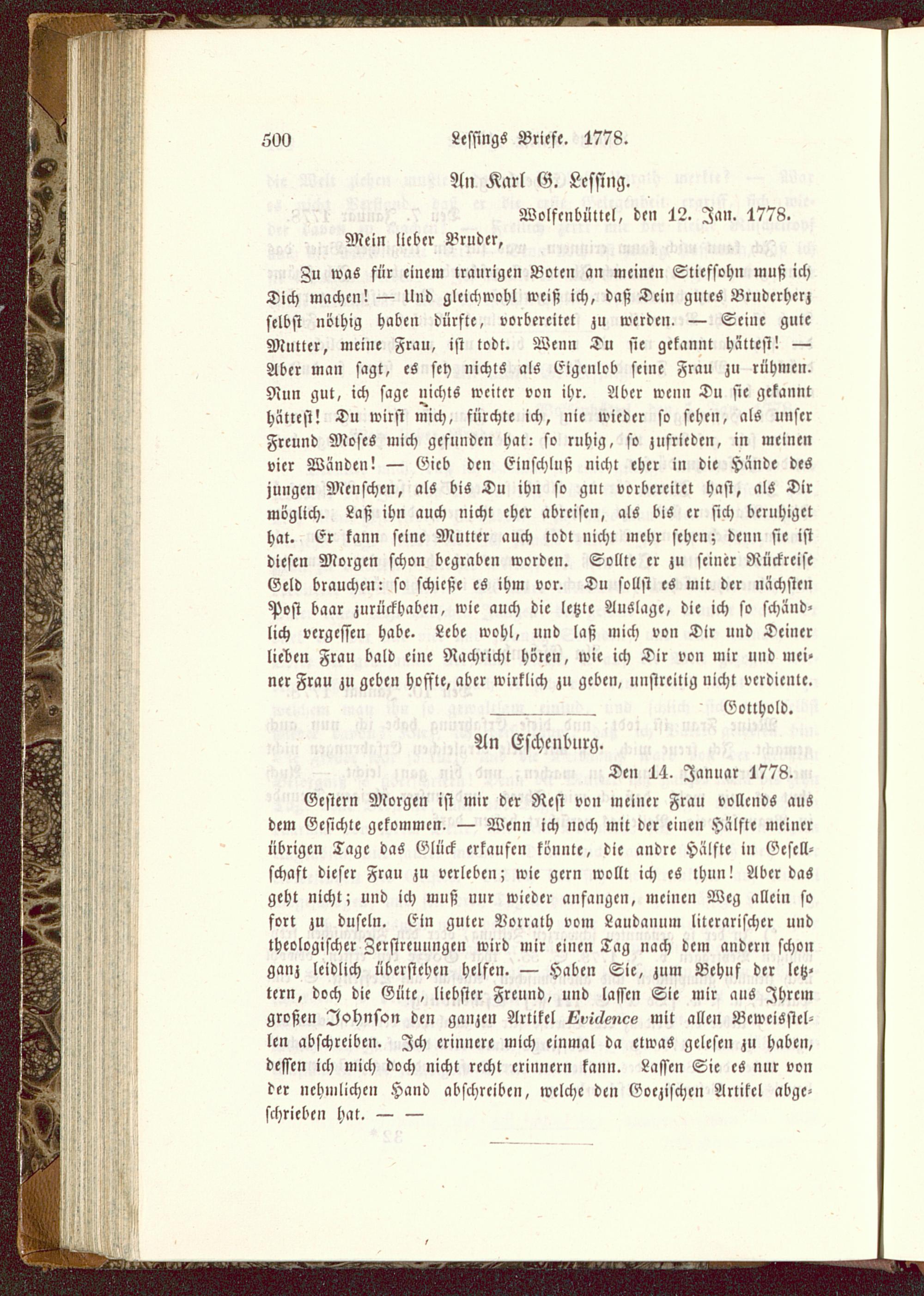 Den 14. Januar 1778.Gestern Morgen ist mir der Rest von meiner Frau vollends ansdem Gesichte gekommen. — Wenn ich noch mit der einen Hälfte meinerübrigen Tage das Glück erkaufen könnte, die andre Hälfte in Gesell-schaft dieser Frau zu verleben; wie gern wollt ich es thun! Aber dasgeht nicht; und ich muß nur wieder anfangen, meinen Weg allein sofort zu duseln. Ein guter Norrath vom Laudanum literarischer undtheologischer Zerstreuungen wird mir einen Tag nach dem andern schonganz leidlich überstehen helfen. — Haben Sie, zum Behuf der letz-tern, doch die Güte, liebster Freund, und lassen Sie mir aus Ihremgroßen Johnson den ganzen Artikel I?vi</e,ice mit allen Beweisstel-len abschreiben. Ich erinnere mich einmal da etwas gelesen zu haben,dessen ich mich doch nicht recht erinnern kann. Lassen Sie cS nur vonder nehmlichen Hand abschreiben, welche den Goezischen Artikel abge-schrieben hat. — —