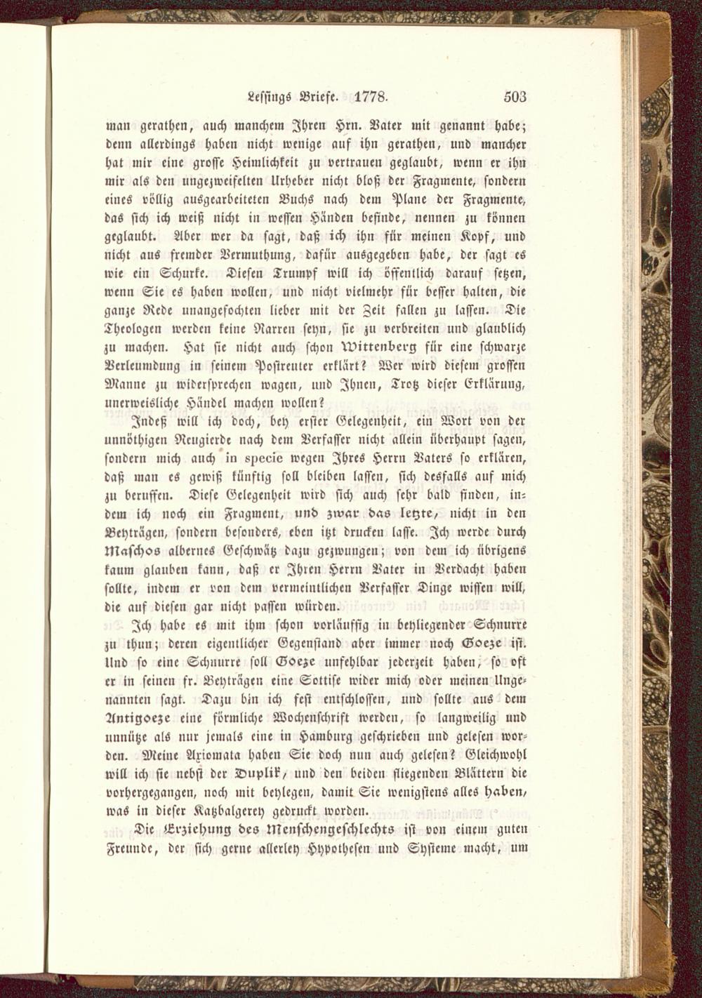 Ich habe eS mit ihm schon voriäuffig in beylegender Schnurrezu thun; deren eigentlicher Gegenstand aber iuimcr noch Goeze ist.Und so eine Schnurre soll Goeze unfehlbar jederzeit haben, so ofter in seinen fr. Beyträgen eine Sottise wider mich oder meinen Unge-nannten sagt. Dazu bin ich fest entschlossen, und sollte aus demAntigoeze eine förmliche Wochenschrift werden, so langweilig undunnütze als nur jemals eine in Hamburg geschrieben und gelesen wor-den. Meine Ariomata habe» Sie doch nun auch gelesen? Gleichwohlwill ich sie »cbst der Duplik, und den beiden fliegenden Blättern dievorhergegangen, noch mit beylegen, damit Sie wenigstens alles habe»/was in dieser Katzbalgerei) gedruckt worden.