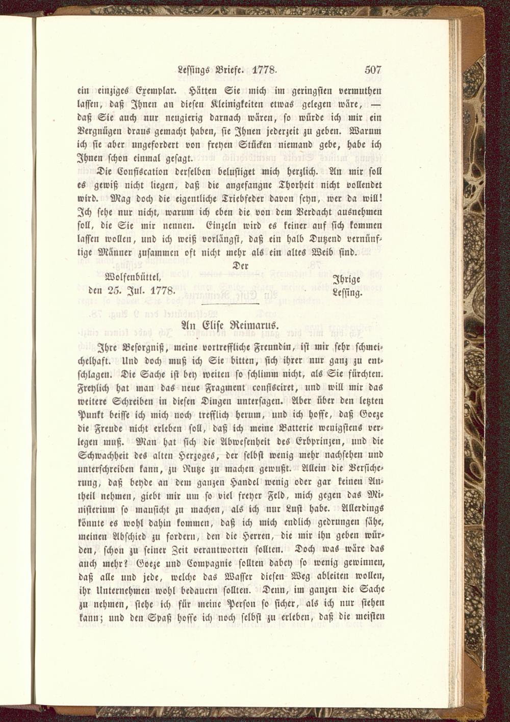 Ihre Besorgniß, meine vortreffliche Freundin, ist mir sehr schmei-chelhaft. Und doch muß ich Sie bitten, sich ihrer nur ganz zu ent-schlagen. Die Sache ist bey weiten so schlimm nicht, als Sie fürchten.Freylich hat man das neue Fragment consiScirel, und will mir dasweitere Schreiben in diesen Dingen untersagen. Aber über den letztenPunkt beisse ich mich »och trefflich herum, und ich hoffe, daß Goezedie Freude nicht erleben soll, daß ich meine Batterie wenigstens ver-legen mnß. Man hat sich die Abwesenheit des Erbprinzen, und dieSchwachheit des alten Herzoges, der selbst wenig mehr nachsehen undunterschreiben kann, zu Nutze zn machen gewußt. Allein die Versiche-rung, daß beyde an dem ganzen Handel wenig oder gar keinen An-theil nehmen, giebt mir um so viel freyer Feld, mich gegen das Mi-nisterium so mausicht zu machen, als ich nur Lust habe. Allerdingskönnte es wohl dahin kommen, daß ich mich endlich gedrungen sähe,meinen Abschied zu fordern, den die Herren, die mir ihn geben wür-den, schon zu seiner Zeit verantworten sollten. Doch was wäre dasauch mehr? Goeze und Compagnie sollten dabey so wenig gewinnen,daß alle und jede, welche das Wasser diese» Weg ableiten wollen,ihr ttntcrnchmen wohl bedauern sollten. Denn, im ganzen die Sachezu nehmen, stehe ich für meine Person so sicher, als ich nur stehenkann; und den Spaß hoffe ich noch selbst zu erleben, daß die meisten