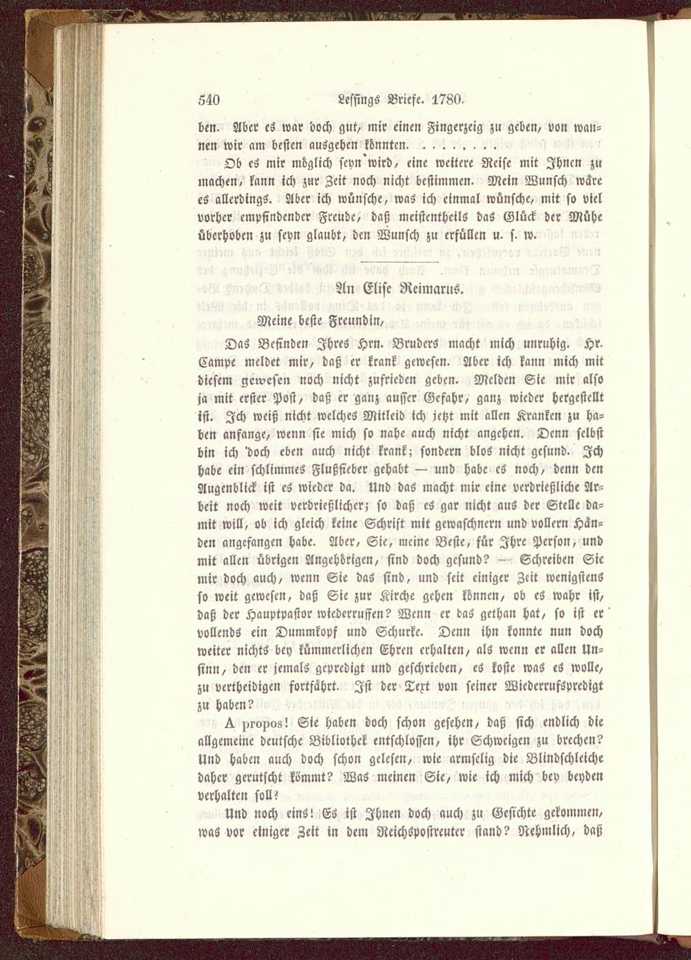 Das Befinden Ihres Hrn. Bruders macht mich unruhig. Hr.Campe meldet mir, daß er krank gewesen. Aber ich kann mich mitdiesem gewesen noch nicht zufrieden geben. Melden Sie mir alsoja mit erster Post, daß er ganz ausser Gefahr, ganz wieder hergestelltist. Ich weiß nicht welches Mitleid ich jetzt mit allen Kranken zu ha-ben anfange, wenn sie mich so nahe auch nicht angehen. Denn selbstbin ich 'doch eben auch nicht krank; sondern blos nicht gesund. Ichhabe ein schlimmes Flußfieber gehabt — und habe cS noch, denn denAugenblick ist es wieder da. Und das macht mir eine verdrießliche Ar-beit noch weit verdrießlicher; so daß es gar nicht aus der Stelle da-mit will, ob ich gleich keine Schrift mit gewaschnern und vollern Hän-den angefangen habe. Aber, Sie, meine Beste, für Ihre Person, undmit allen übrigen Angehörigen, sind doch gesund? - Schreiben Siemir doch auch, wenn Sie das sind, und seit einiger Zeit wenigstensso weit gewesen, daß Sie zur Kirche gehen können, ob es wahr ist,daß der Hauptpastor wtcderruffen? Wenn er das gethan hat, so ist ervollends ein Dummkopf und Schurke. Denn ihn konnte nun dochweiter nichts bey kümmerlichen Ehren erhalten, als wenn er allen Un-sinn, den er jemals gepredigt und geschrieben, es koste was es wolle,zu vertheidigen fortfährt. Ist der Text von seiner Wiedcrrufspredigtzu haben?