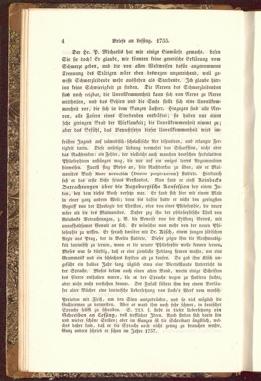 frühen Zugend auf talmudisch-scholastische Art disputircu, und erlangte Fer-tigkeit darin. Diese unselige Uebung vermehrt den Scharfsinn, nicht aberdas Nachdenken: ein Fehler, der vielleicht auch manche» deutschen spekulativenPhilosophiern anhängen mag, die nur auf ein ewiges leeres Argumcntirenhinweisen. Zuerst fing Moses an, sein Nachdenken zu üben, als er Mai-mottides Buch Alors nevocliim (vocior perpwxorum) studirtc. Hierdurchsah er das erste Licht seines Vcrsta»dcS. Nun fand er einst ReinbeckaBetrachtungen über die AuFsburgische Ronfession bey einem Ju-den, bey dem dieses Buch versetzt war. Er fand steh hier mit einem Malein einer ganz andern Welt; denn bis dahin hatte er nicht den geringstenBegriff von der Theologie der Christen, oder von einer Philosophie, die neuerwäre als die des Maimonidcs. Daher zog ihn der philosophische Theil vonReiiibecks Betrachtungen, z. B> die Beweise von der Existenz GottcS, mitunaufhaltsamer Gewalt an sich. Er wünschte uuu mehr von der neuen Phi-losophie zu wissen. Er sprach darüber mit Dr. Risch, einem jungen jüdischenArzte aus Prag, der in Berlin studirtc. Dieser zeigte ihm die Nothwendig-keit lateinisch zu lernen, wenn er die neuere Philosophie wolle kennen lernen.Moses war so dürftig, daß er eine ziemliche Zeitlang sparen mußte, um eineGrammatik und ein schlechtes Lerikou alt zu taufen. Da gab ihm Kisch un-gefähr ein halbes Zahr lang täglich etwa eine Viertelstunde Unterricht i»der Sprache. Moses bekam auch eine» alte» Band, worin einige Schriftendes Cicero enthalten waren, die er der Sprache wegen zu studiren suchte,aber nicht recht vcrstchcn konnte. Der Zufall führte ihm bey cincm Verkäu-fer aller Bücher eine lateinische Uebcrsetzung von Locke's Werk vom mcnsch-